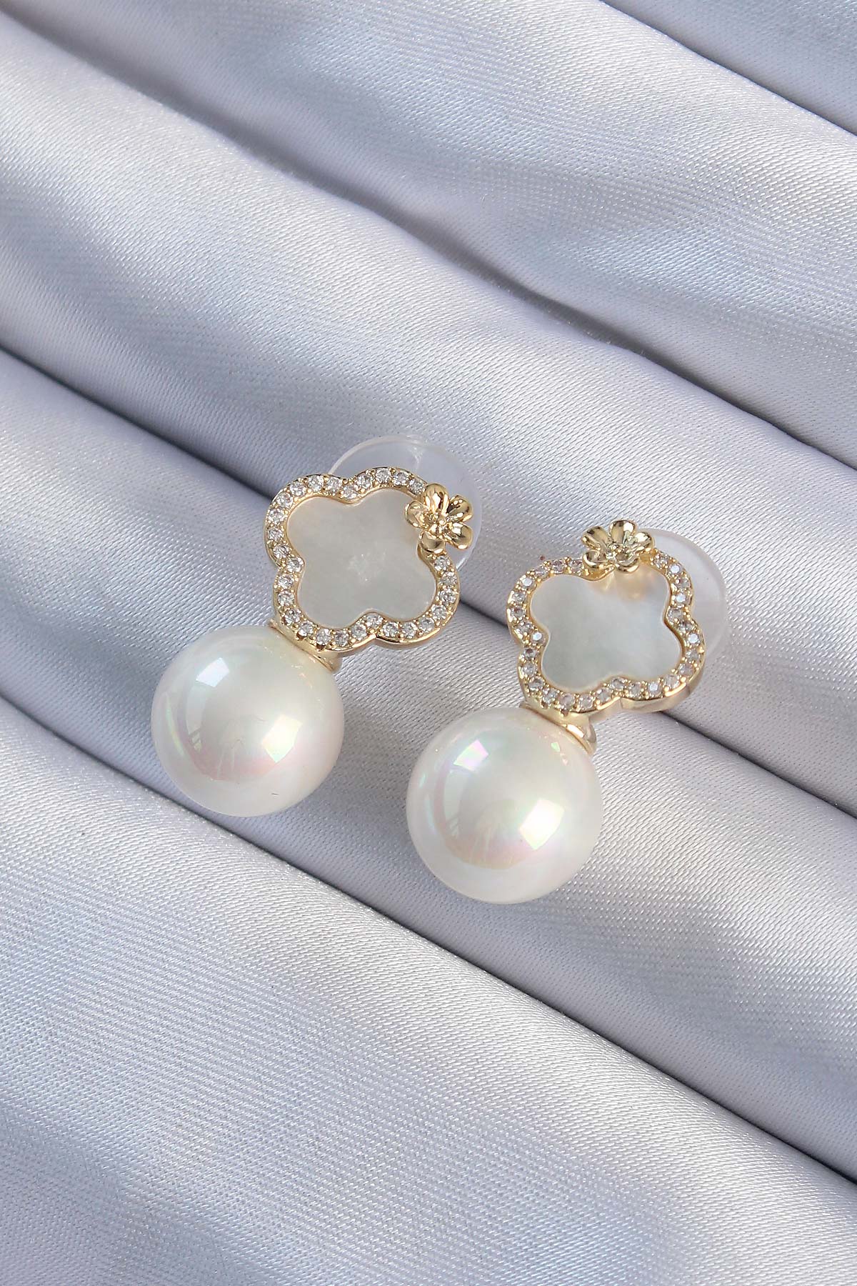 Pirinç Altın Renk Zirkon Taşlı Minimal Çiçek Tasarımlı Kadın Küpe