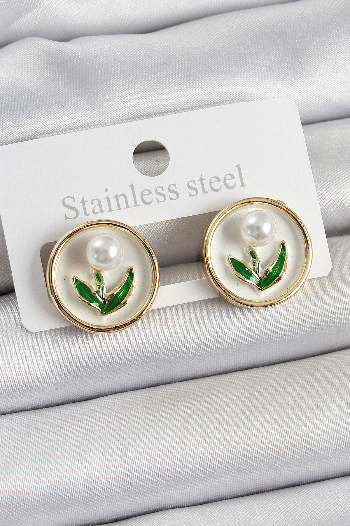 Pirinç Beyaz Mineli Lale Figürlü Sanatsal Portre Model Gold Renk Kadın Küpe