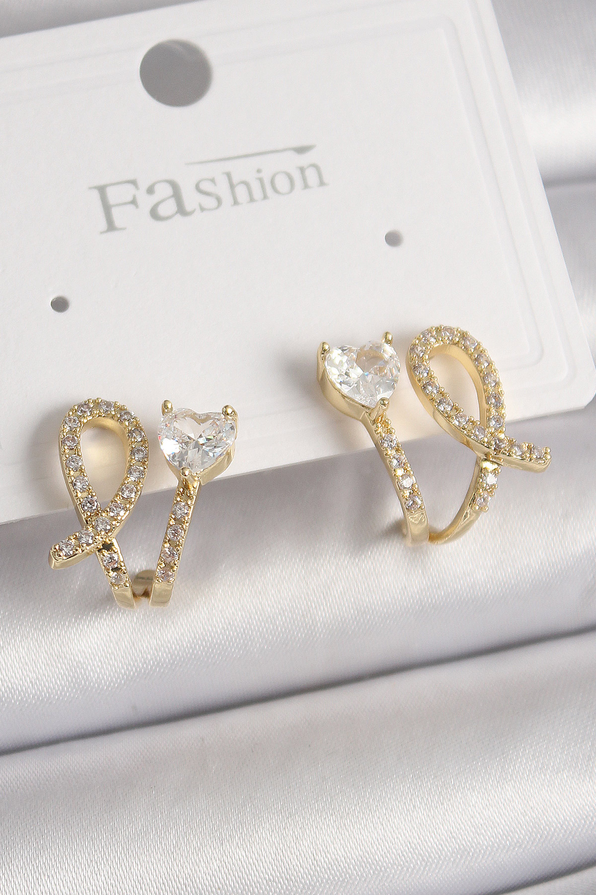 Pirinç Gold Renk Düğüm Model Zirkon Taşlı Kalp Detay Kadın Küpe