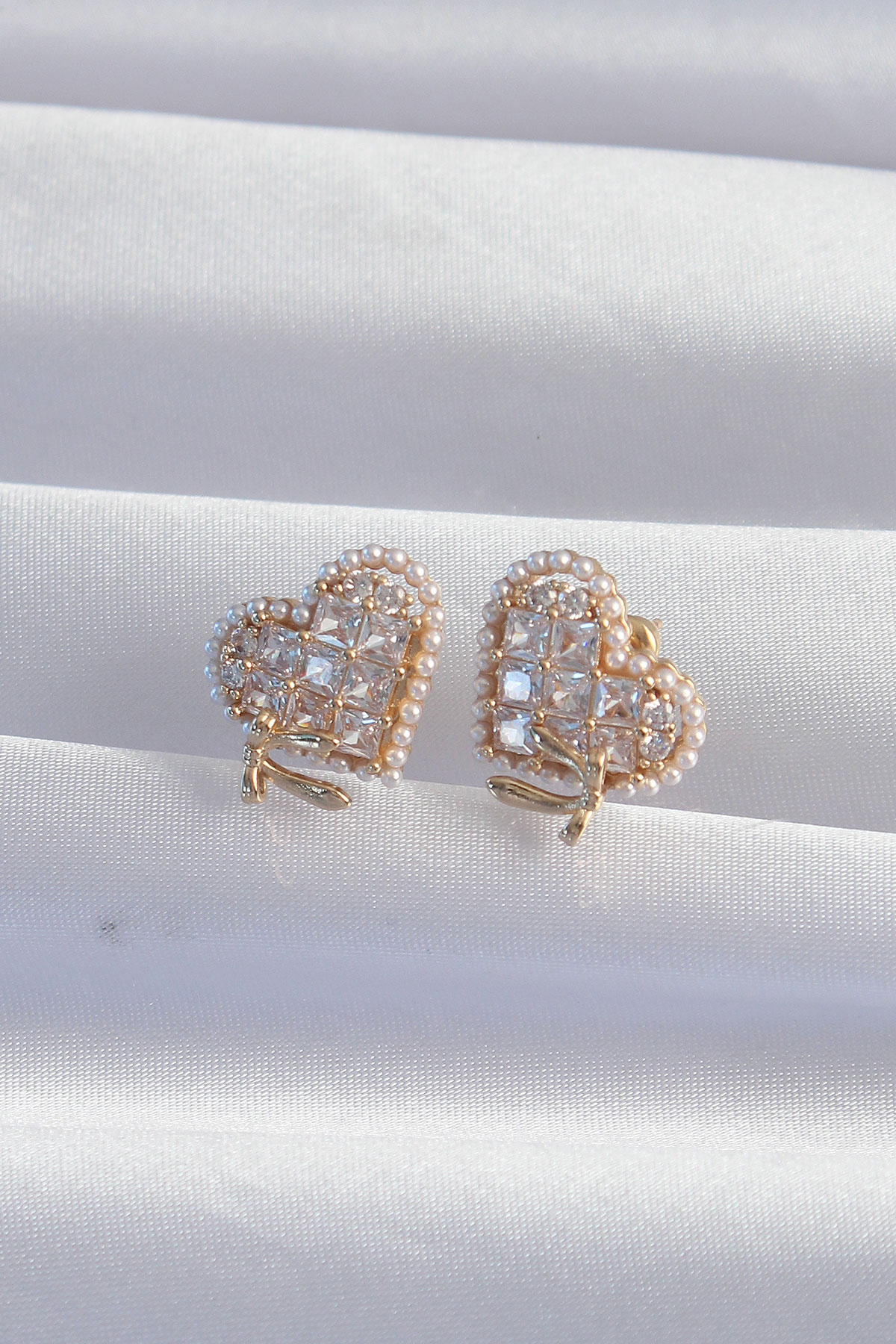 Pirinç Gold Renk Fiyonk Detay İncili Zirkon Taşlı Kalp Küpe