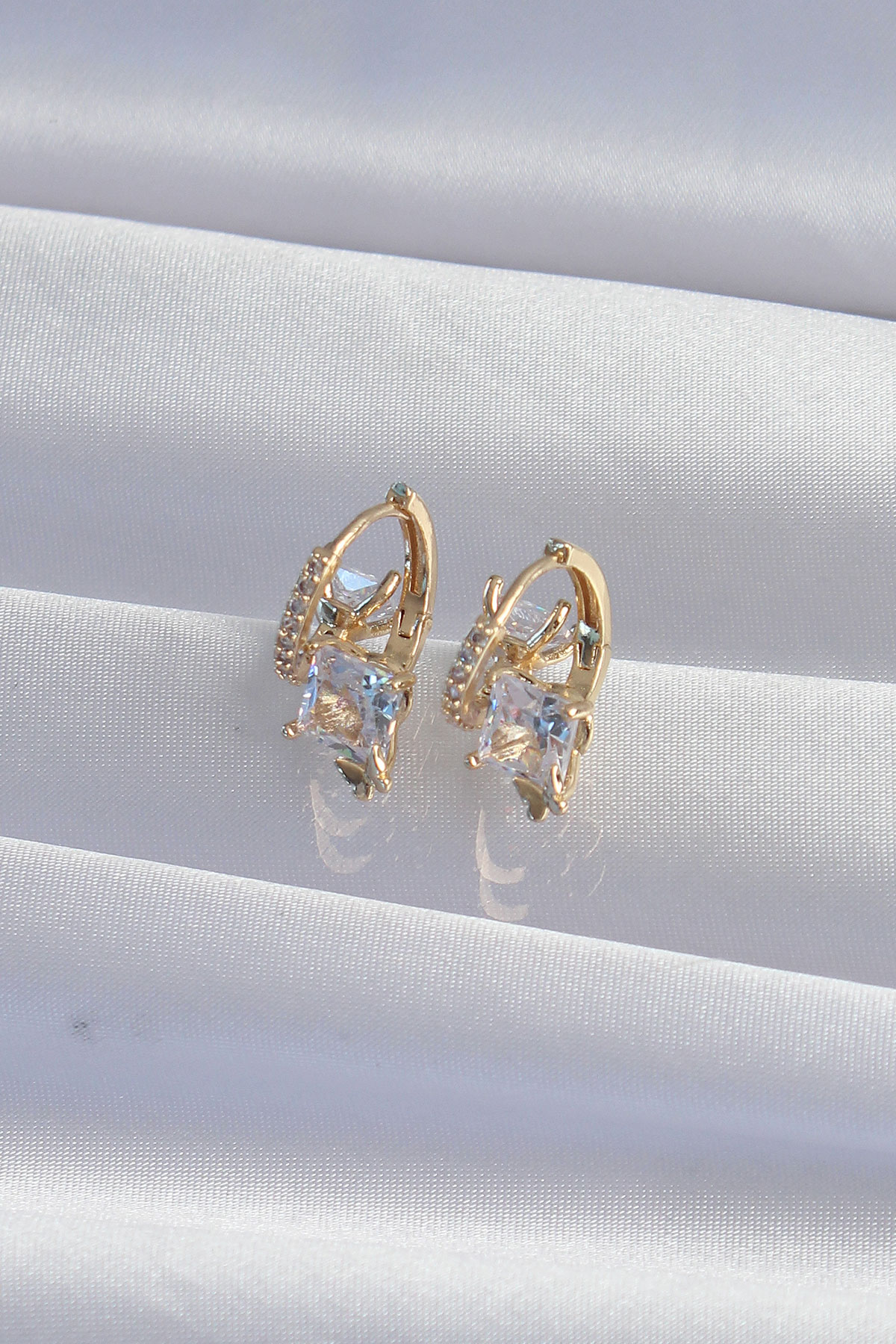Pirinç Gold Renk İri Zirkon Taşlı Kıvrımlı Minimal Kelebekli Halka Küpe