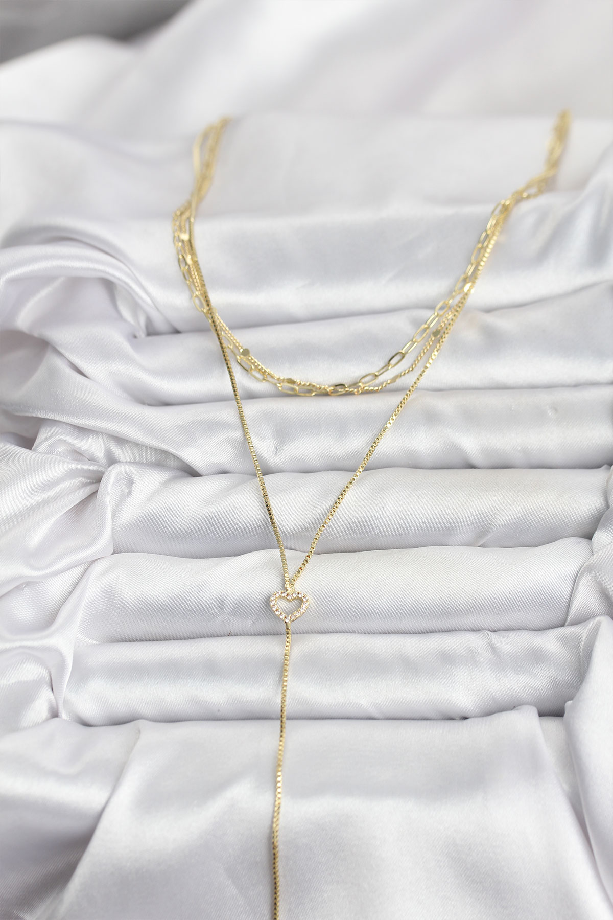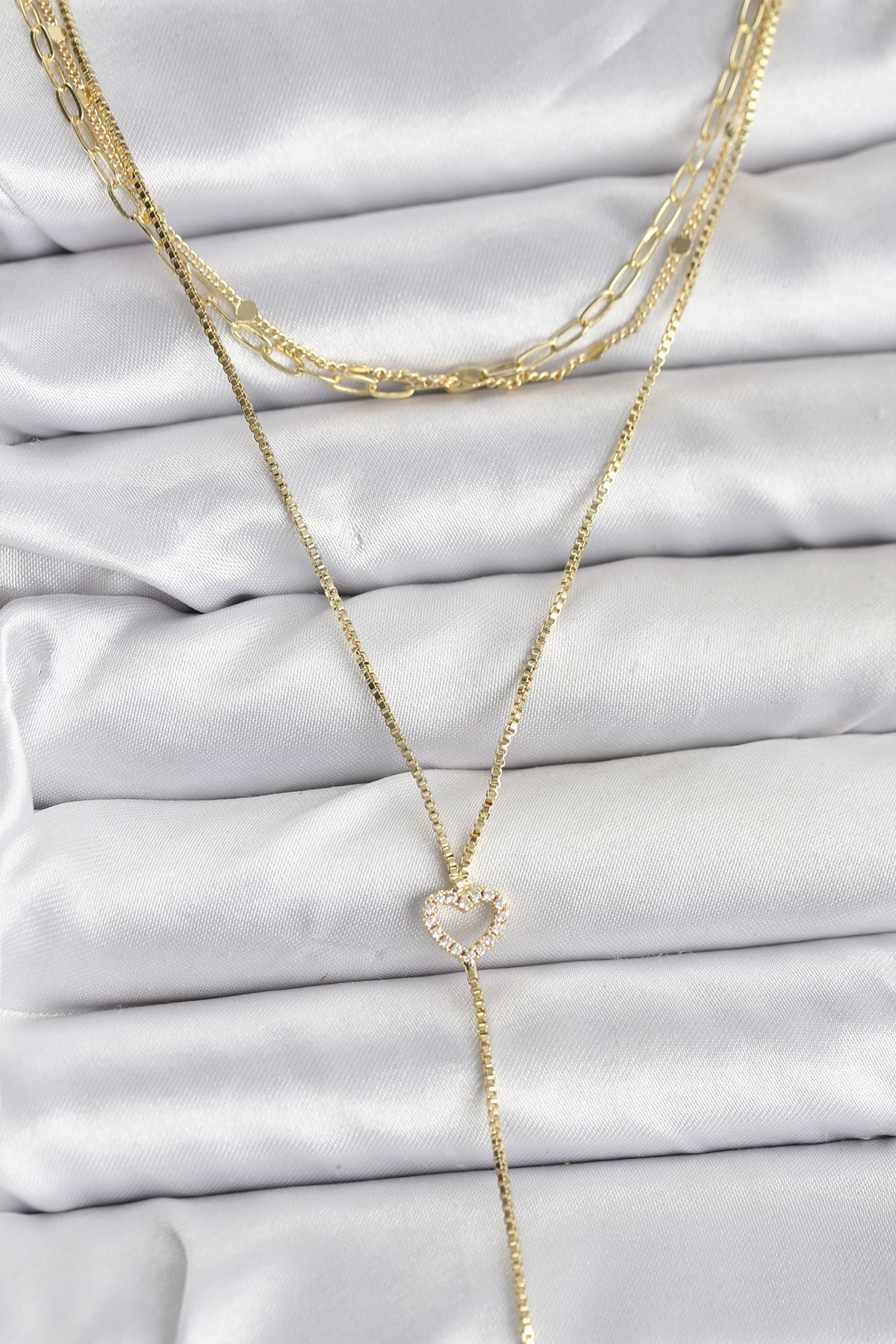 Pirinç Gold Renk Kalp Detaylı 3'lü Kombin Y Kadın Kolye