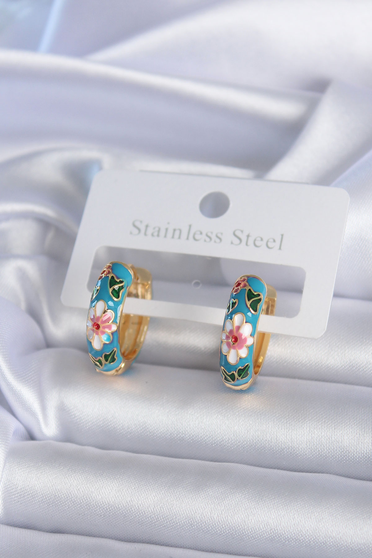 Pirinç Gold Renk Mavi Çiçek İşleme Detay Kadın Küpe