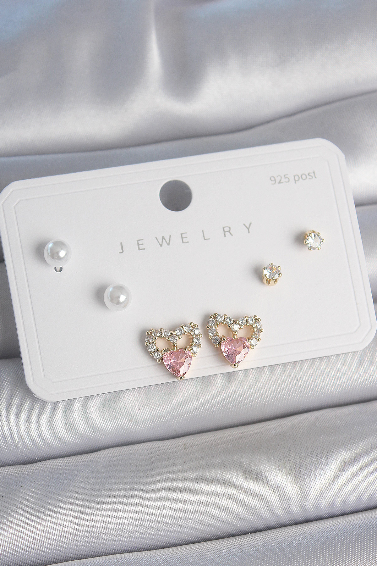 Pirinç Gold Renk Pembe Zirkon Taşlı Kalp Model İnci Detay 925 Ayar Kadın Küpe Seti