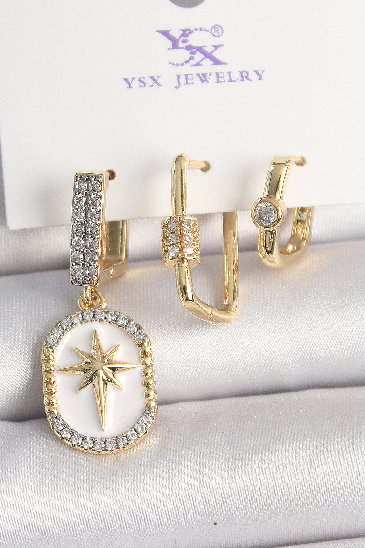 Pirinç Gold Renk Sallantı Zirkon Taş İşlmeli Yıldız Portre Model 3'Lü Kadın Kombin Küpe