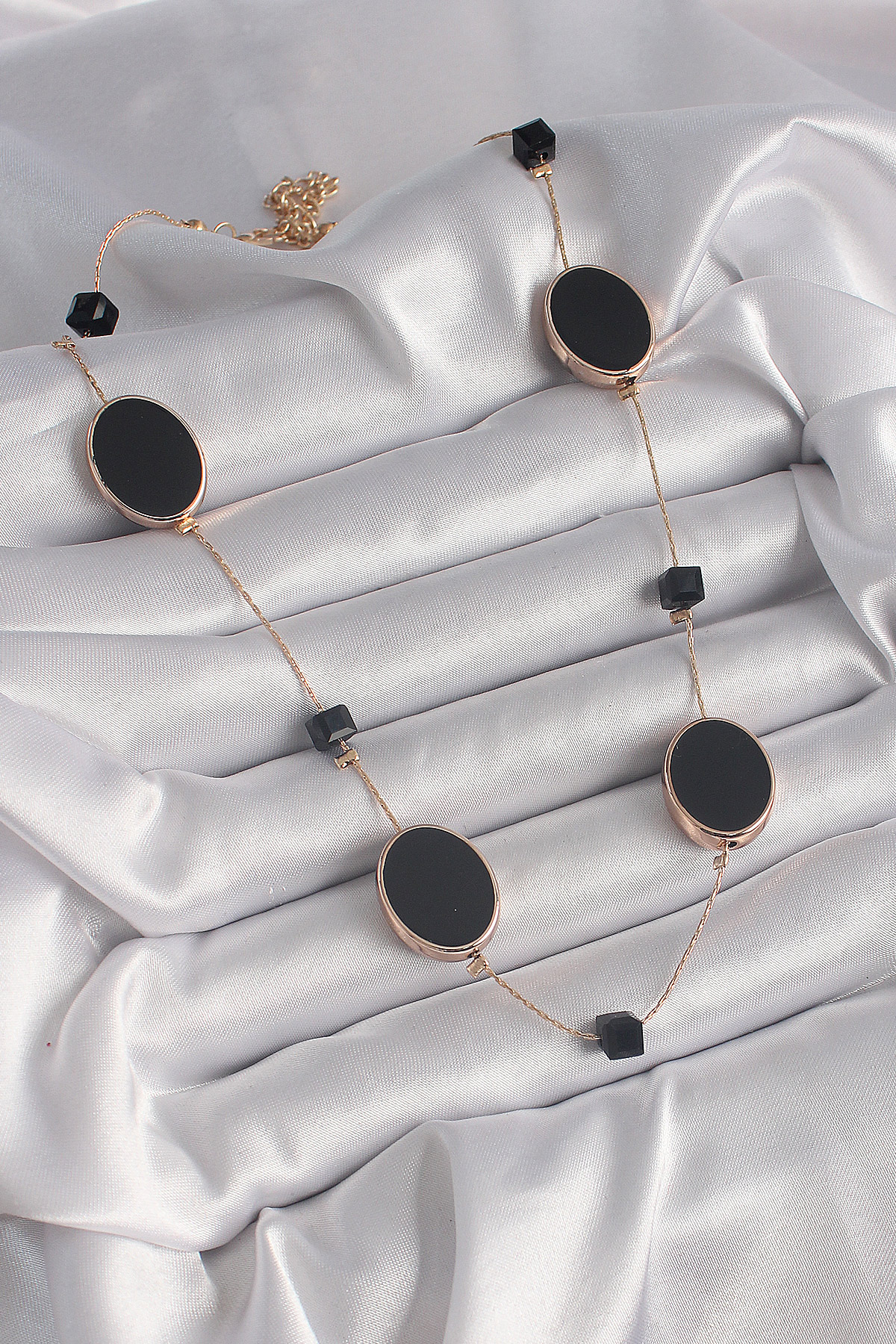 Pirinç Gold Renk Siyah Renk Oval Siyah Küp Detay Kadın Kolye