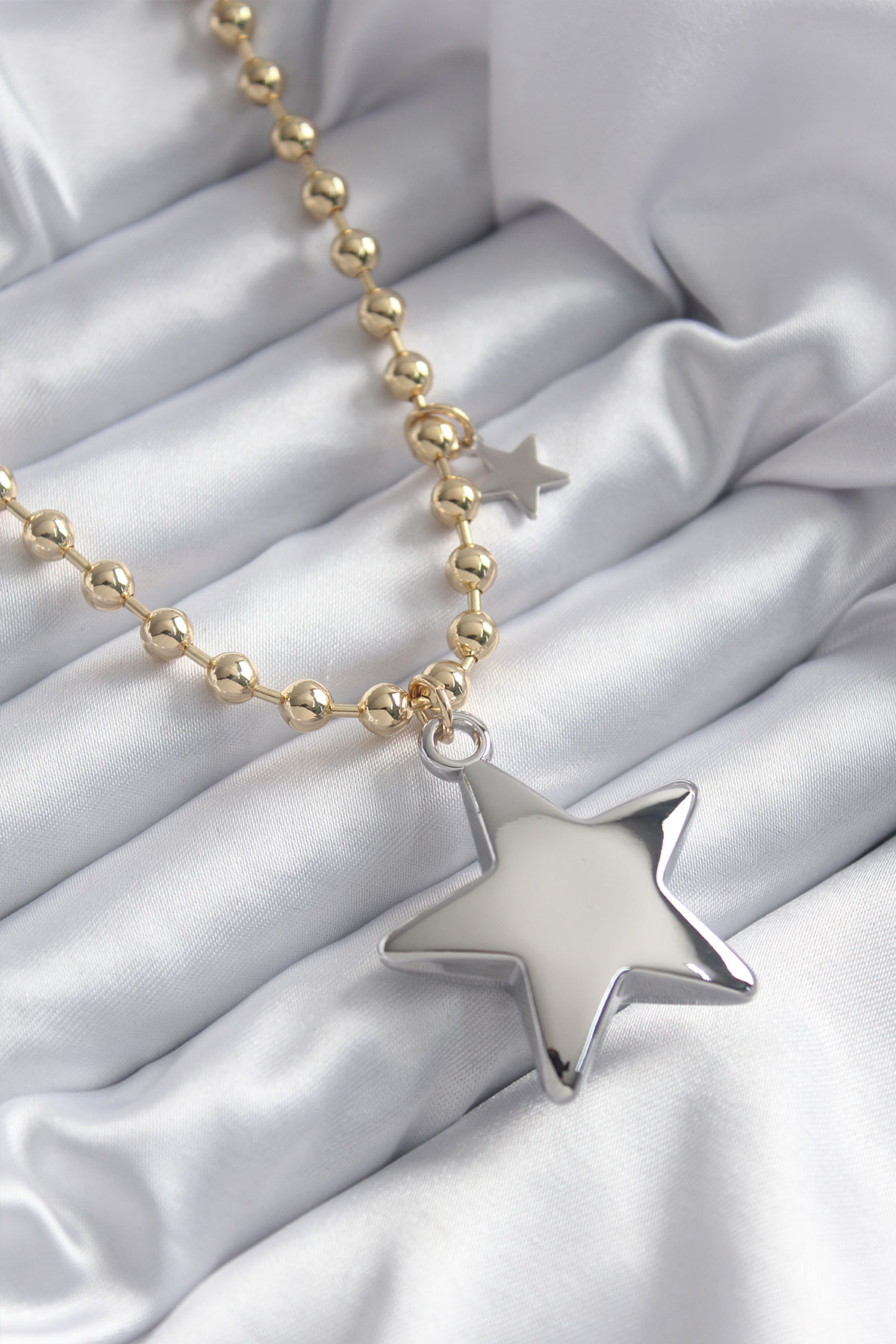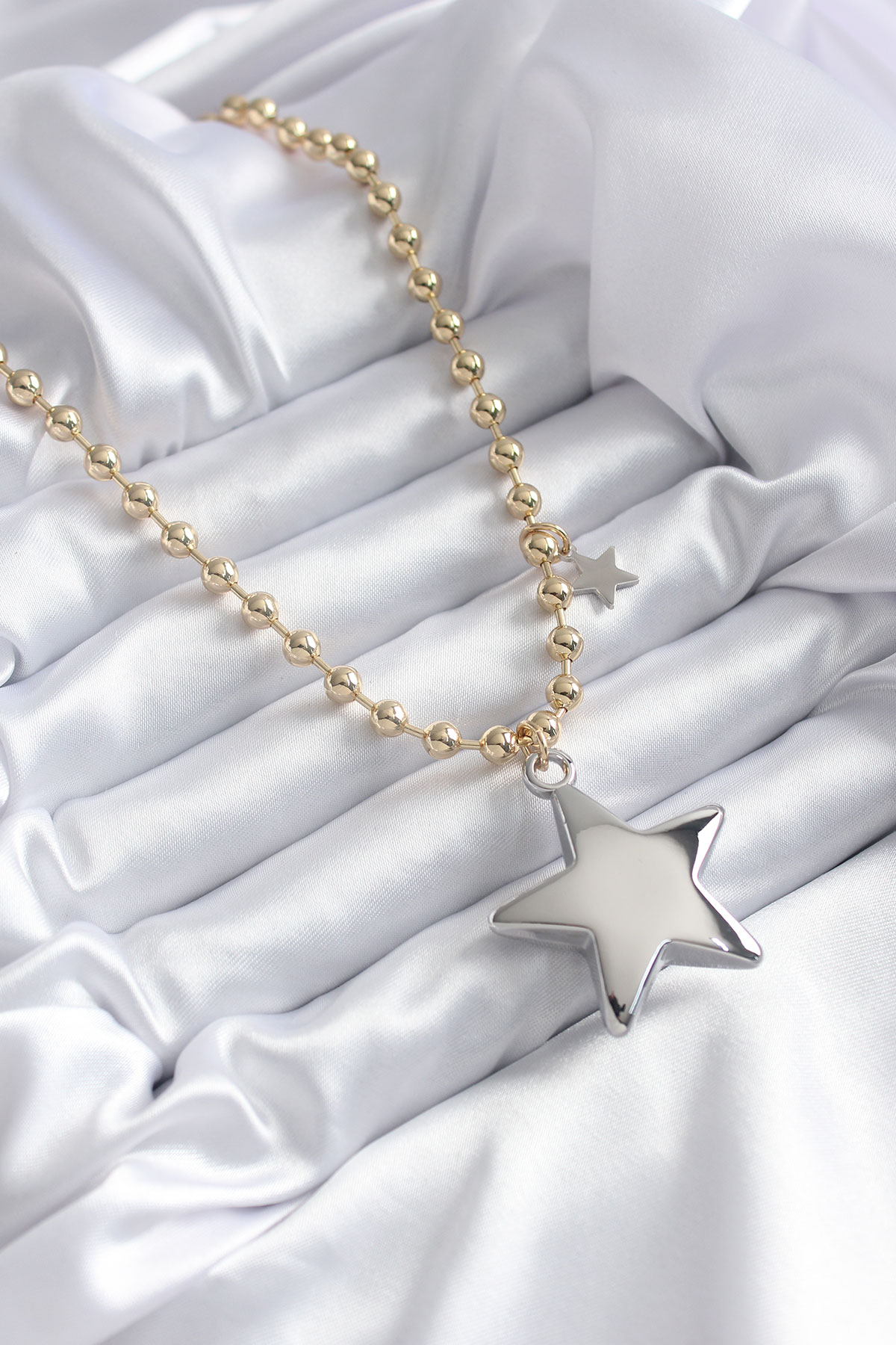 Pirinç Gold Renk Topçuk Zincir Gümüş 3D Yıldız Model Yıldız Detay VİP Kadın Kolye