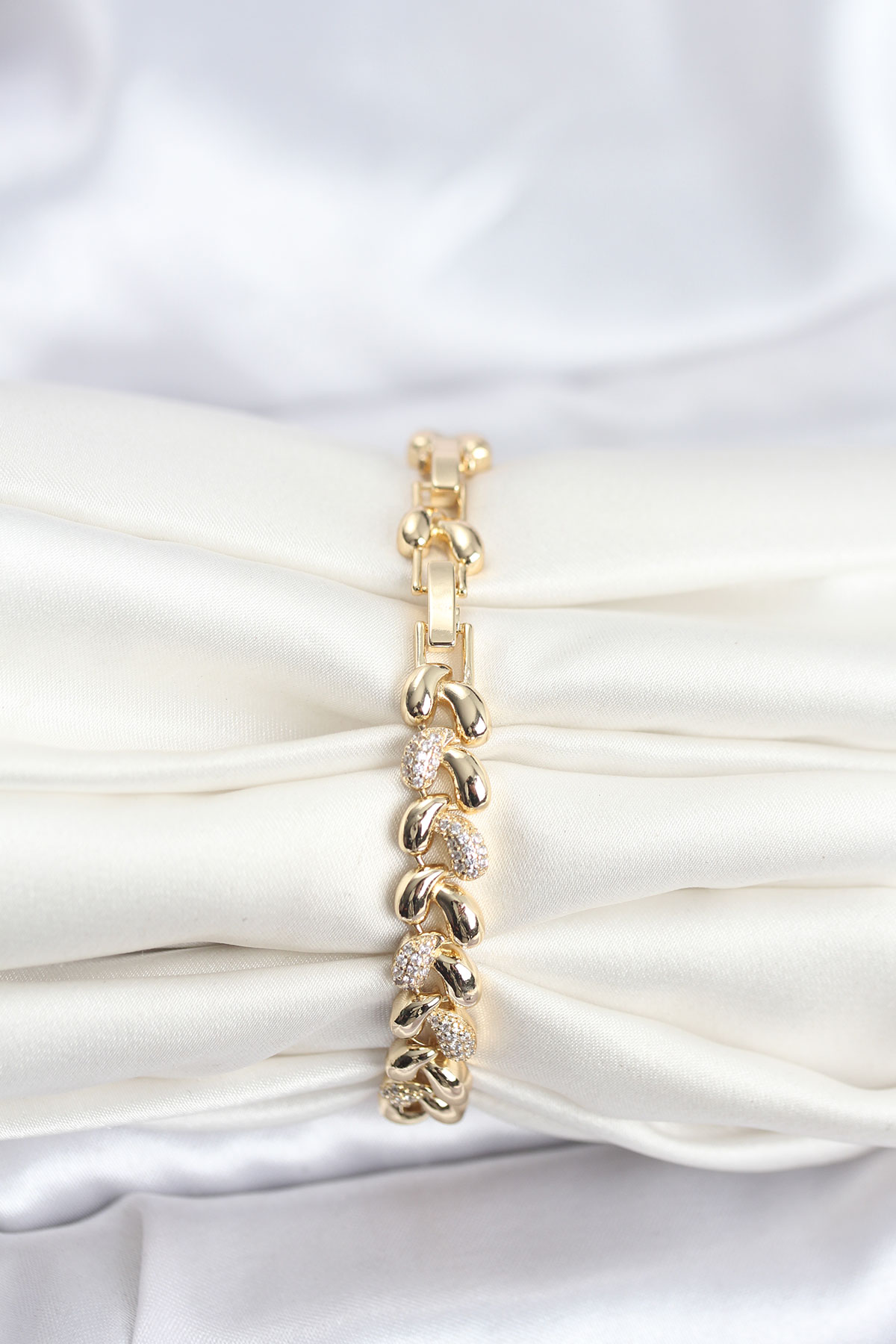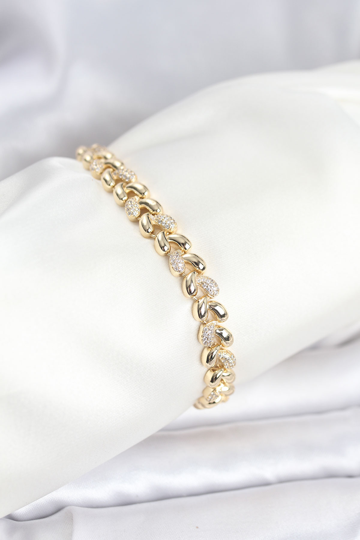 Pirinç Gold Renk VIP Seri Sarmal Damla Model Zirkon Taşlı Kadın Bileklik