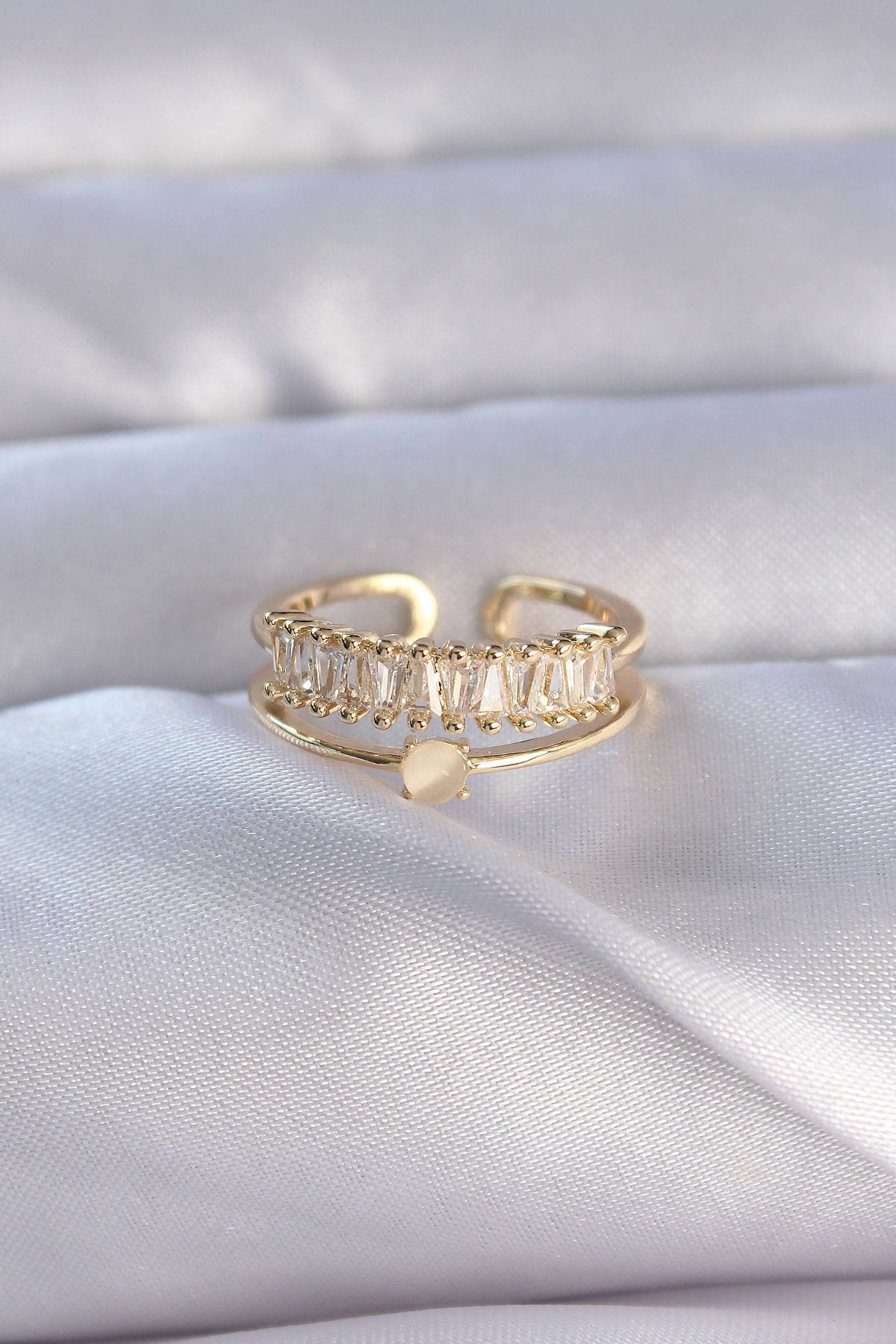 Pirinç Gold Renk Zirkon Taşlı Baget Su Yolu Model Ayarlanabilir Yüzük