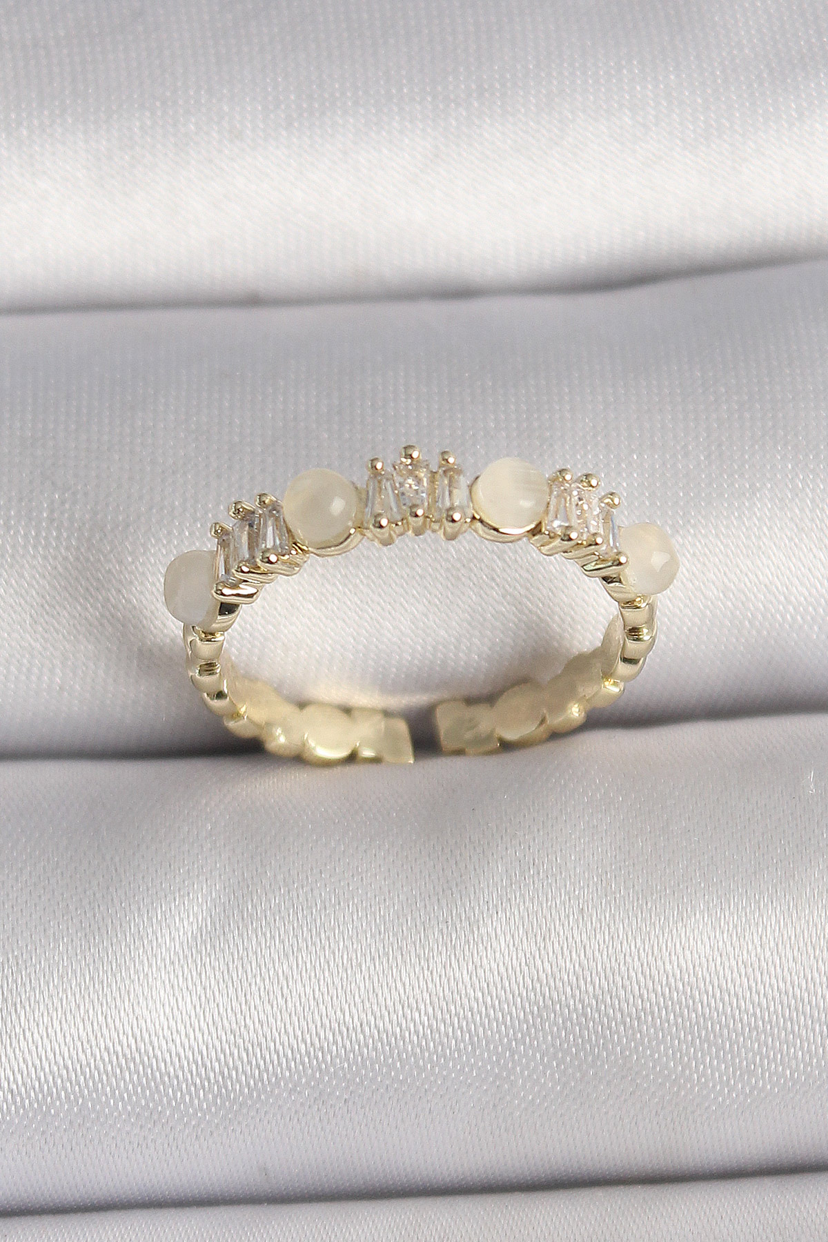 Pirinç Gold Renk Zirkon Taşlı Beyaz Mineli Ayarlanabilir Yüzük