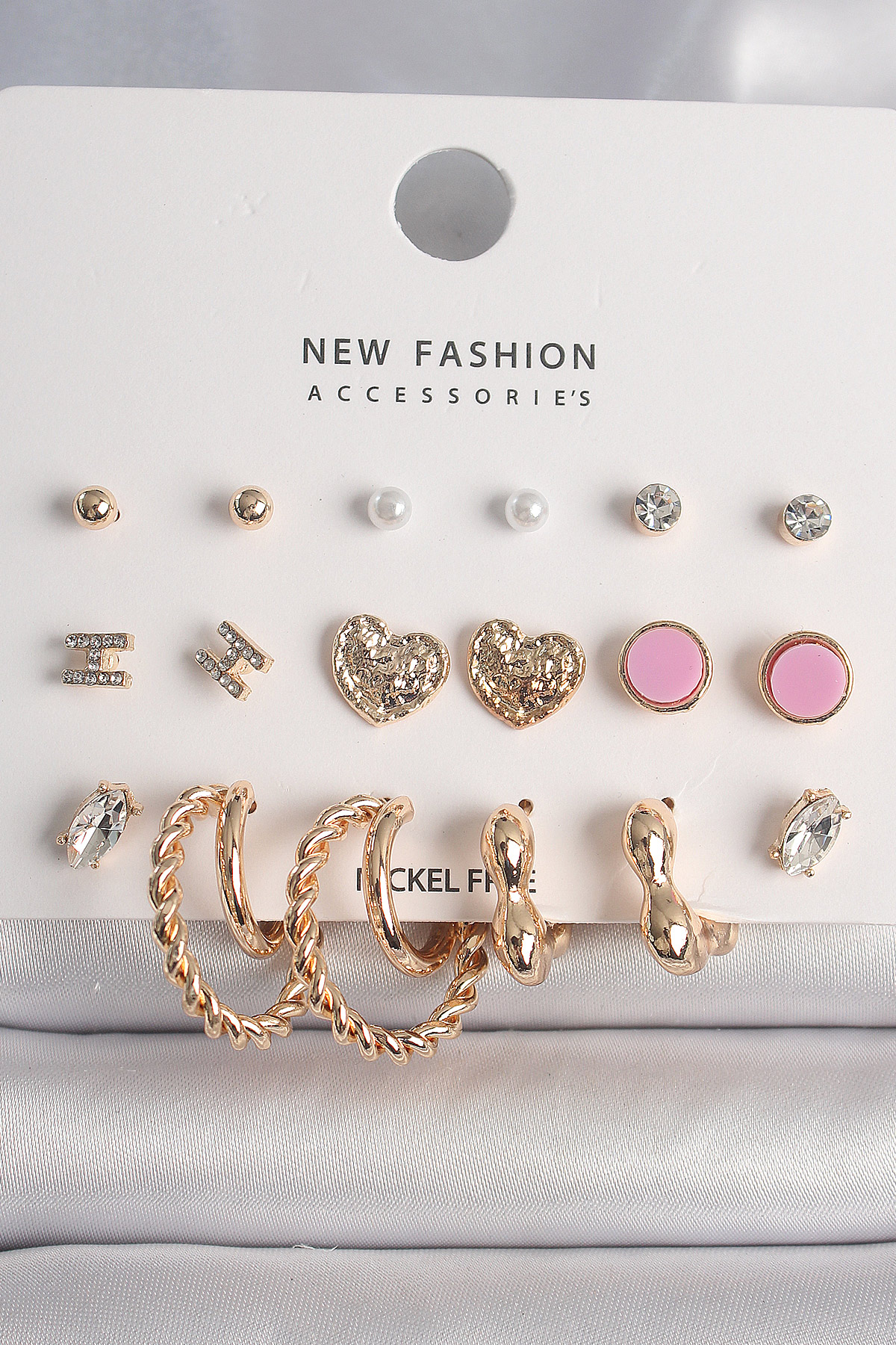 Pirinç Gold Renk Zirkon Taşlı Burug Halka Model İşlemeli Kalp Detay 9 Çift Kadın Küpe Seti