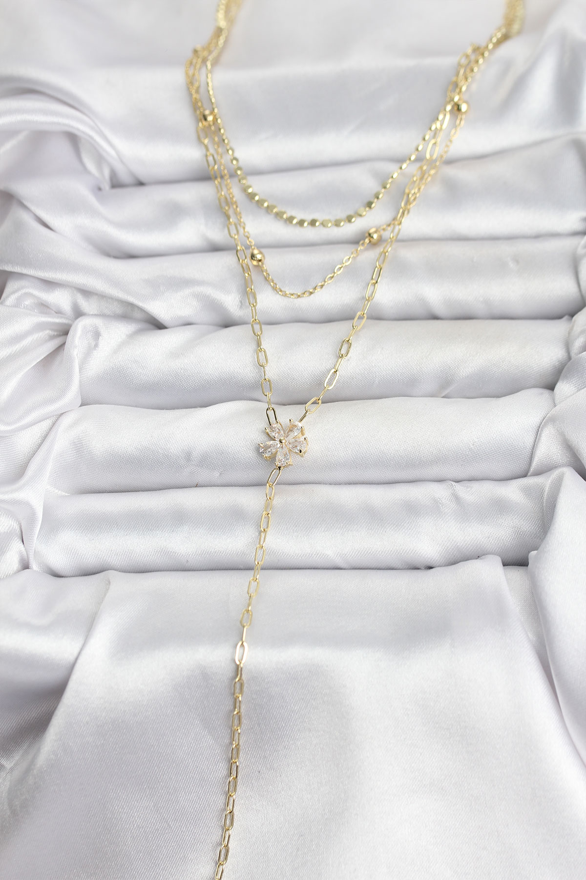 Pirinç Gold Renk Zirkon Taşlı Çiçek Model Detaylı 3'lü Kombin Y Kadın Kolye