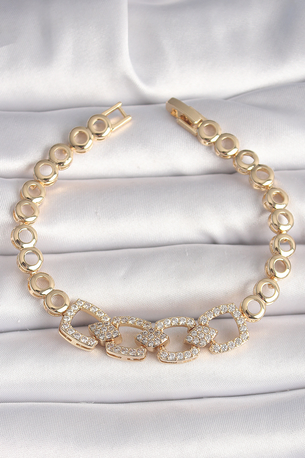 Pirinç Gold Renk Zirkon Taşlı Daire Zincir Model Kadın Bileklik