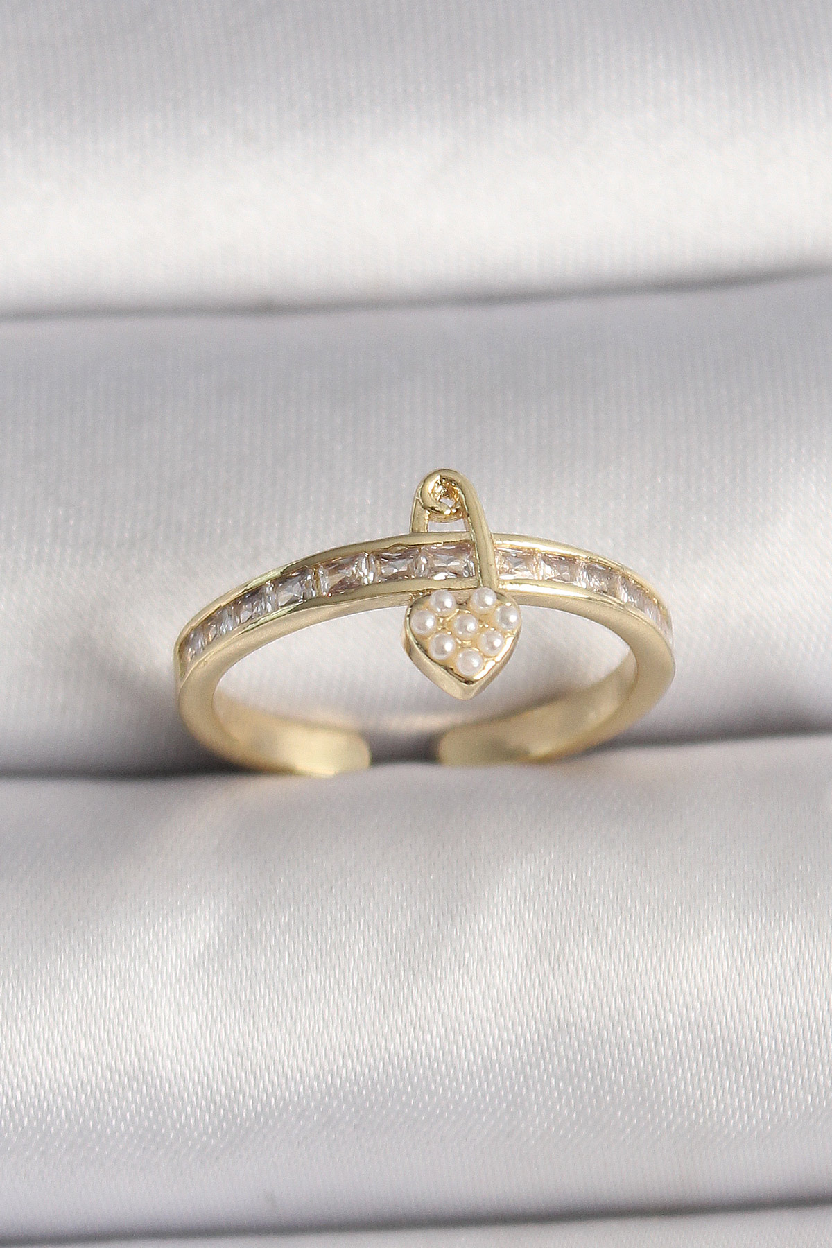 Pirinç Gold Renk Zirkon Taşlı İnci Detay Kilit Kalp Figür Ayarlanabilir Yüzük