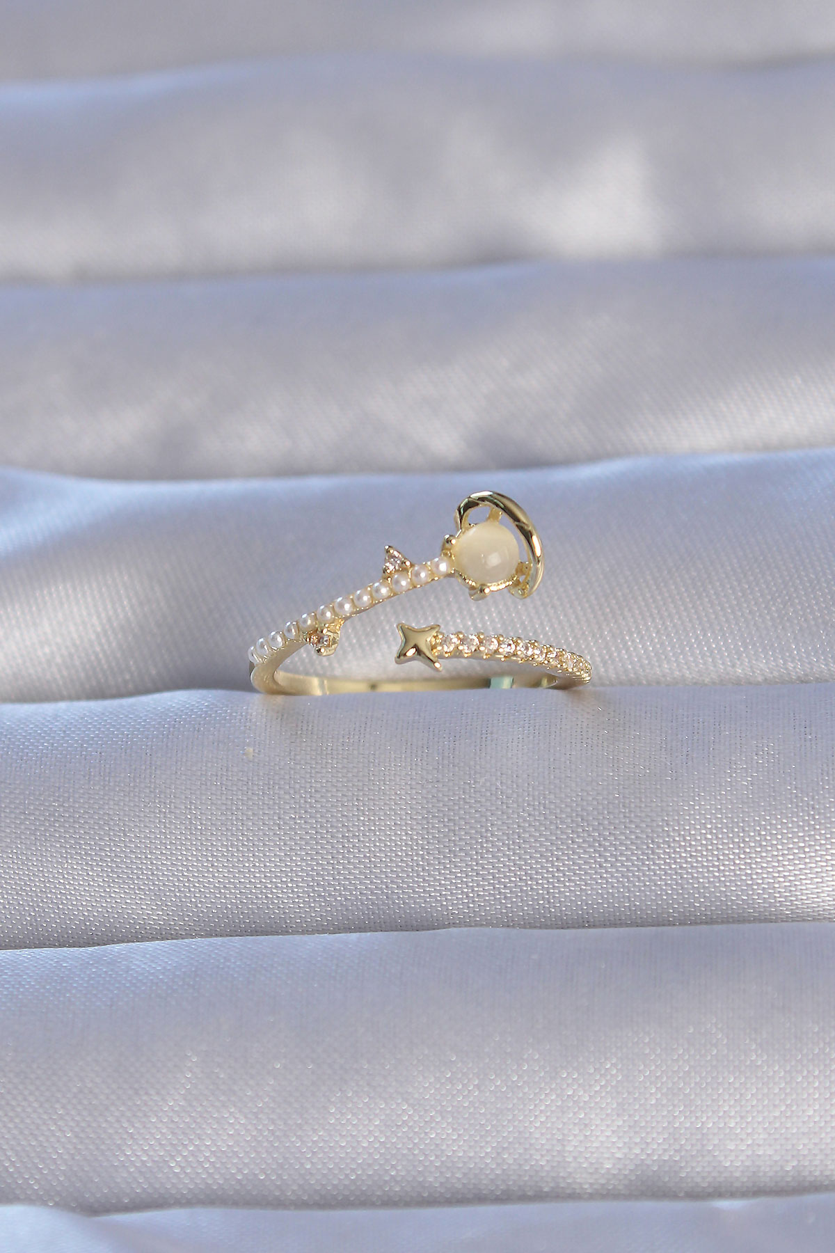 Pirinç Gold Renk Zirkon Taşlı İncili Satürn Model Ayarlanabilir Yüzük