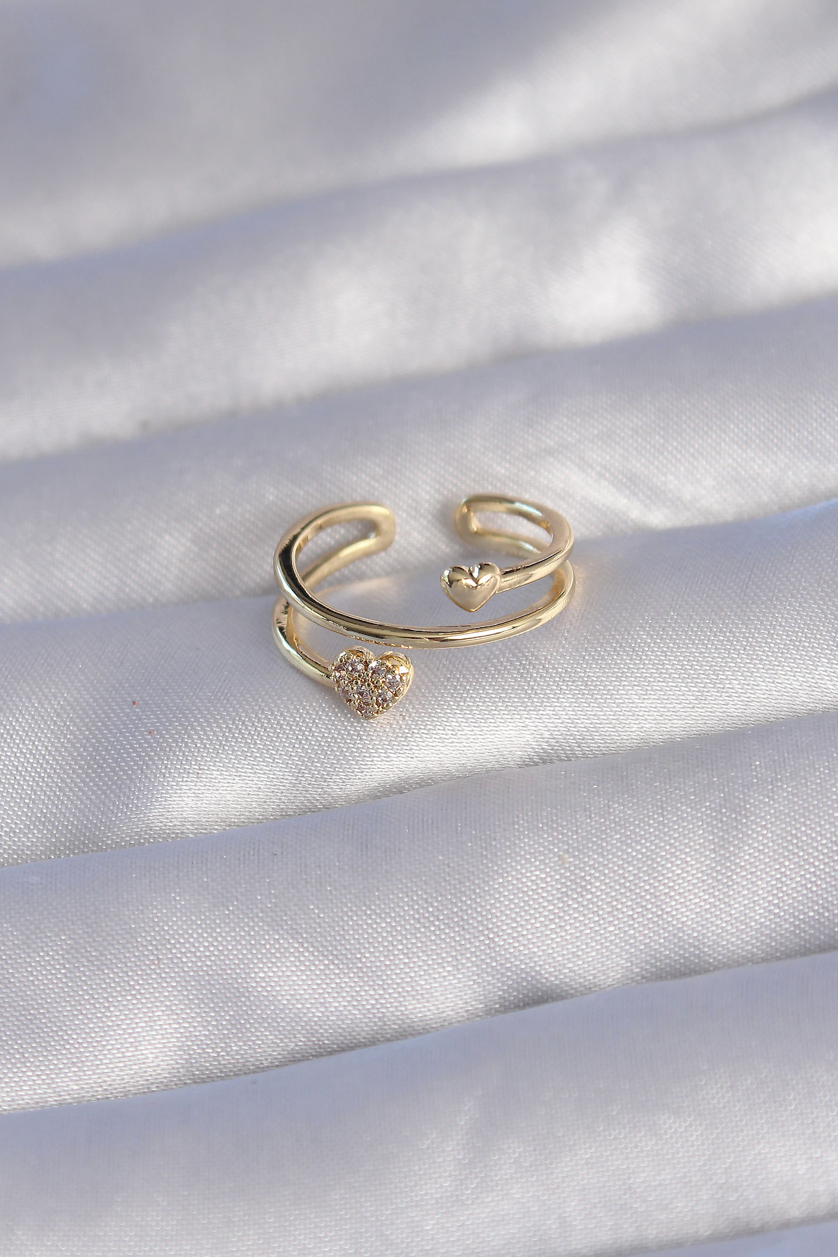 Pirinç Gold Renk Zirkon Taşlı Kalpli Model Ayarlanabilir Yüzük