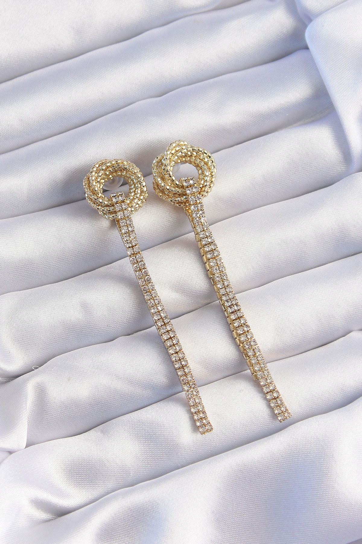 Pirinç Gold Renk Zirkon Taşlı Kıvrım Detay Sallantılı Küpe