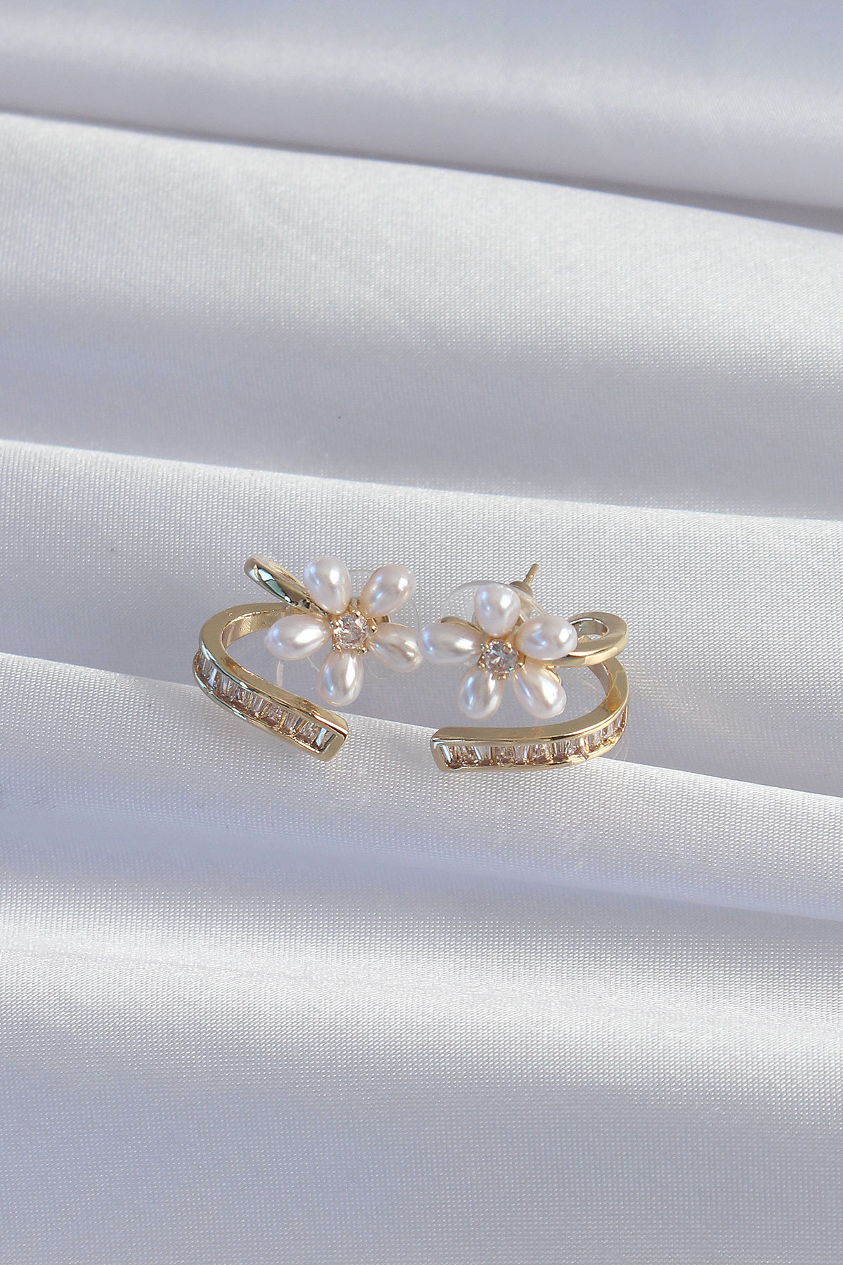 Pirinç Gold Renk Zirkon Taşlı Kıvrımlı İnci Çiçek Küpe