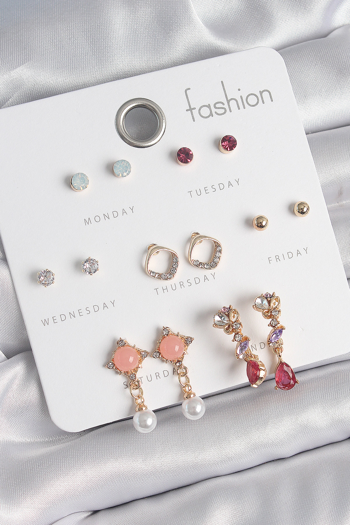 Pirinç Gold Renk Zirkon Taşlı Sallantı İnci Detay 7 Çift Kadın Küpe