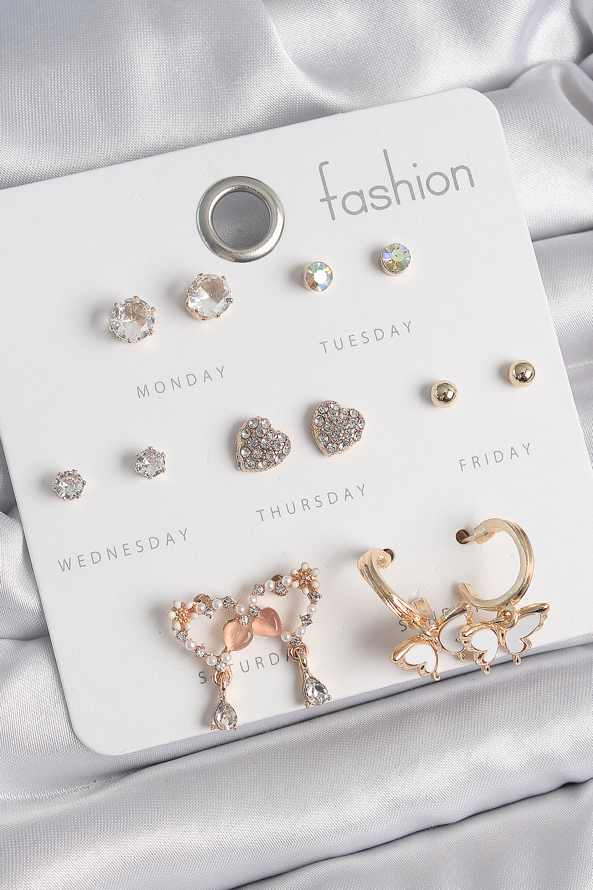 Pirinç Gold Renk Zirkon Taşlı Sallantılı Kalp Figür Kelebek Detay 7 Çift Kadın Küpe Seti