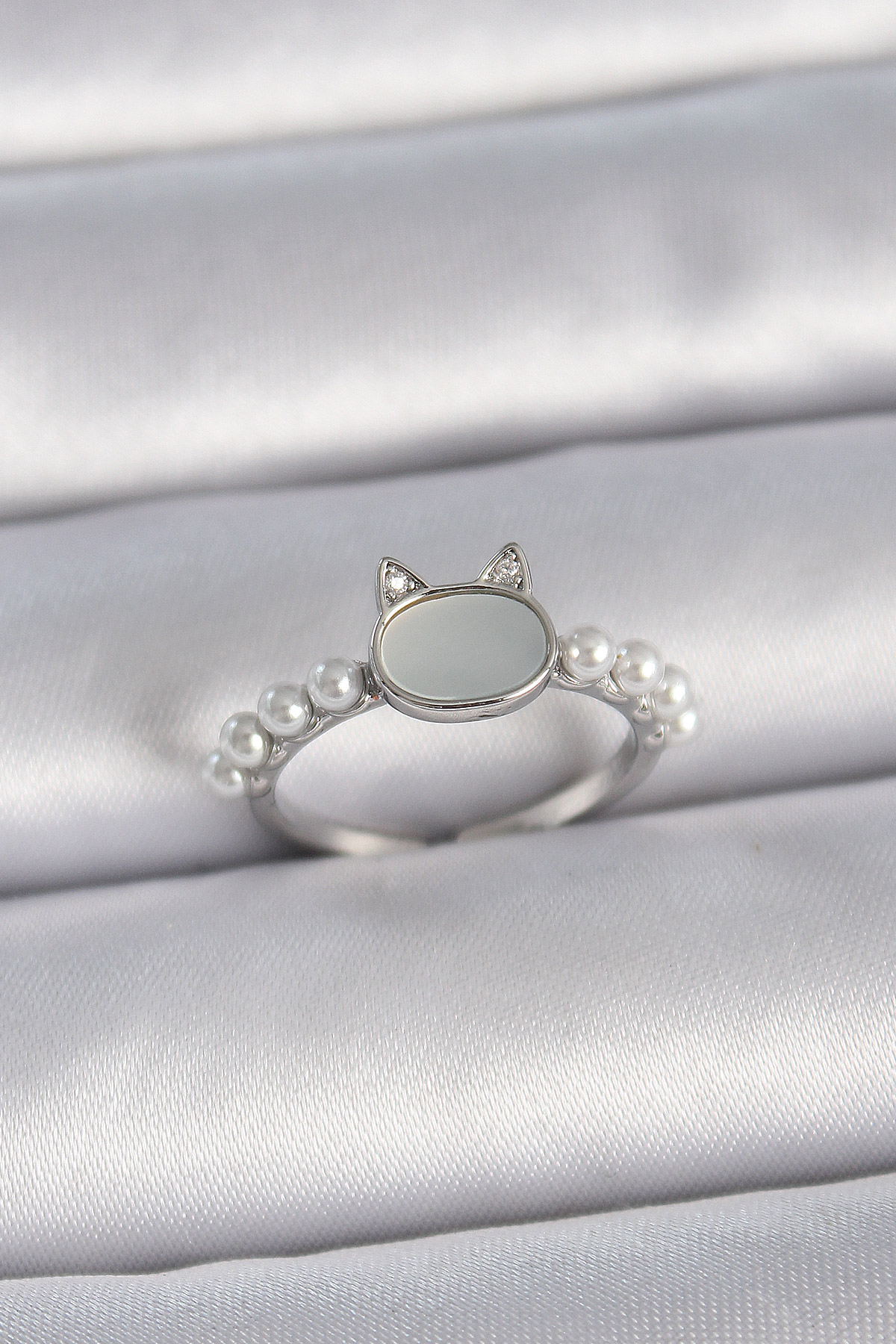 Pirinç Gümüş Renk Ayarlanabilir Beyaz Mineli Kedi Model İnci Detay Kadın Yüzük