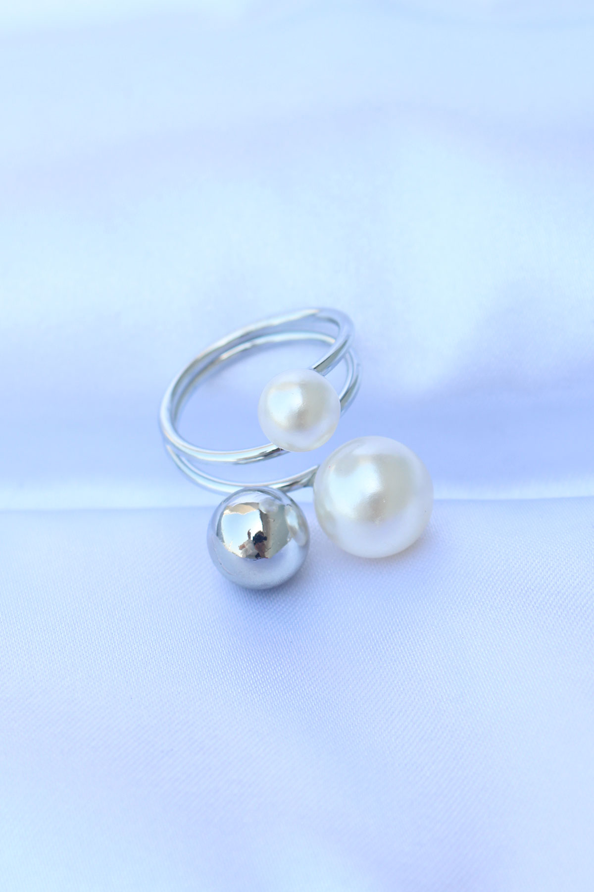 Pirinç Gümüş Renk Ayarlanabilir İnci Taşlı Yüzük