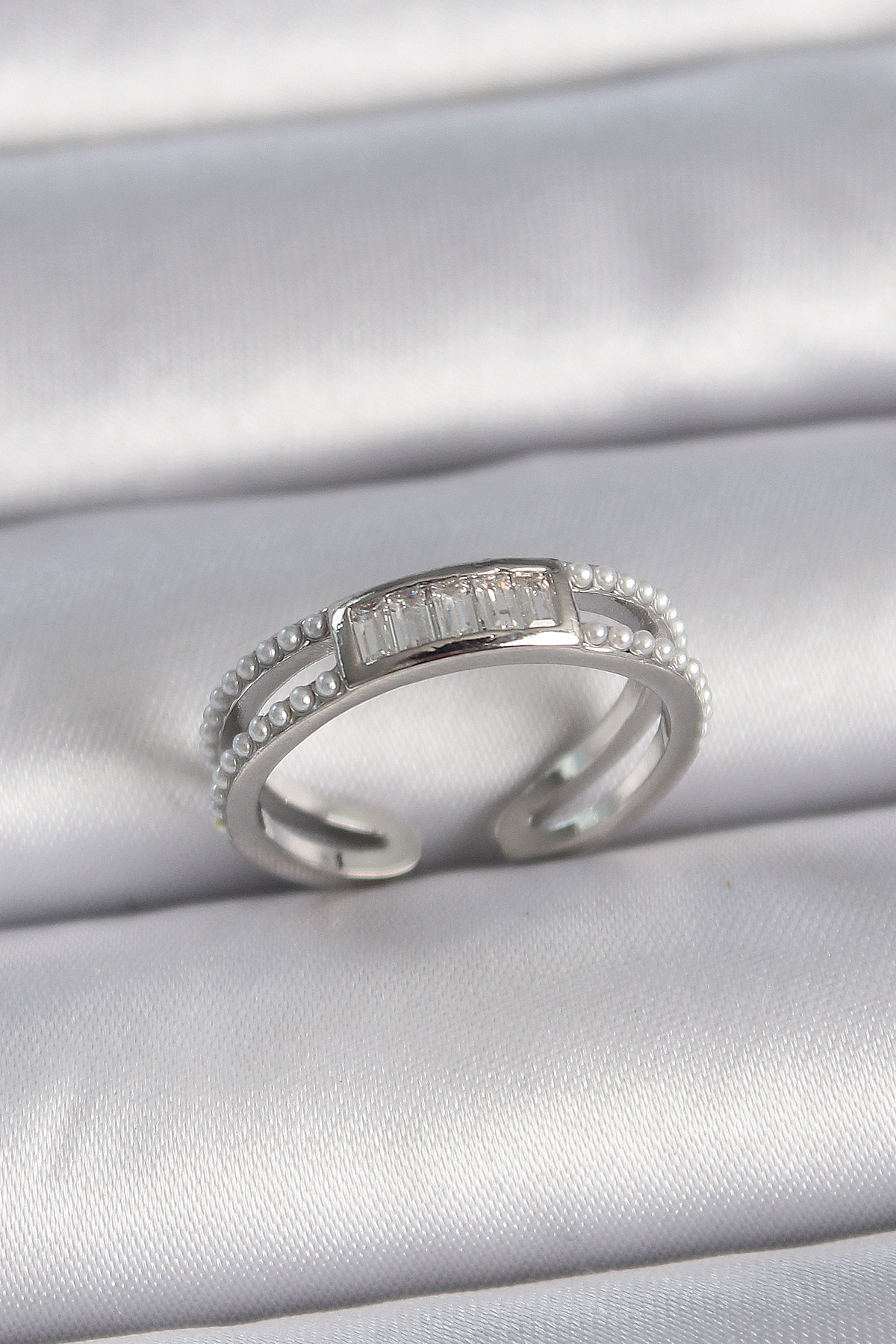 Pirinç Gümüş Renk Ayarlanabilir Sıralı İncili Zirkon Taşlı Kadın Yüzük