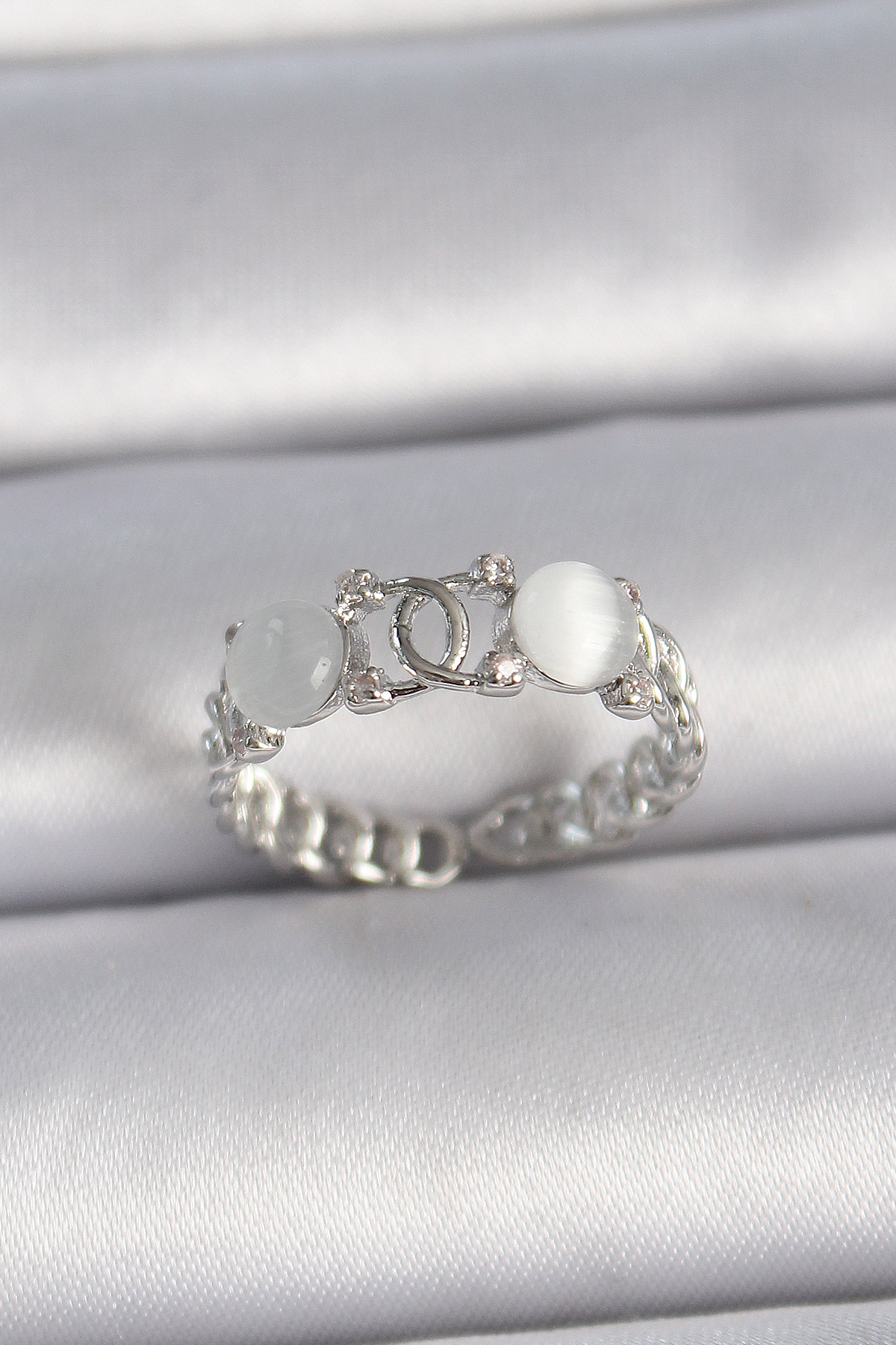 Pirinç Gümüş Renk Ayarlanabilir Zirkon Taşlı Beyaz Mineli Birleşik Halka Model Kadın Yüzük