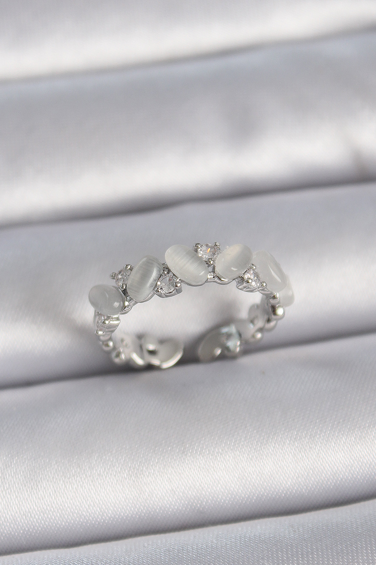 Pirinç Gümüş Renk Ayarlanabilir Zirkon Taşlı Beyaz Mineli Model Kadın Yüzük