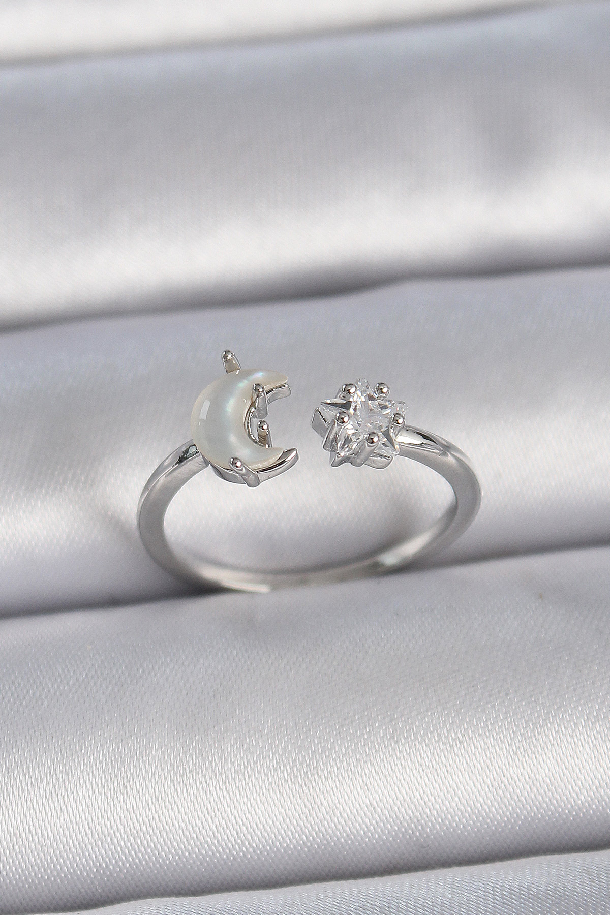 Pirinç Gümüş Renk İncili Hilal Zirkon Taşlı Yıldız Ayarlanabilir Kadın Yüzük