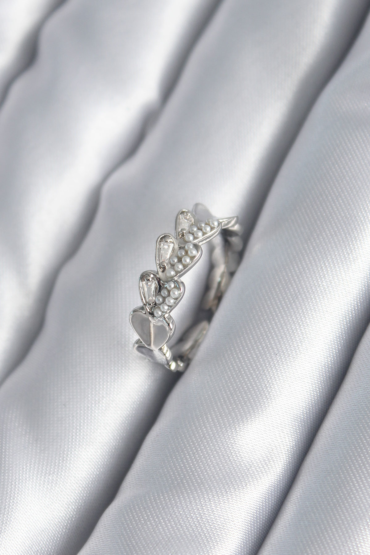 Pirinç Gümüş Renk Kalp Model İnci Detay Kadın Yüzük