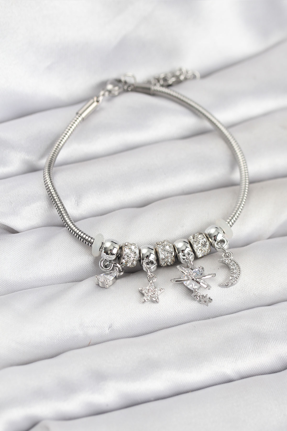 Pirinç Gümüş Renk Kalpli Model Charmlı Kadın Bileklik