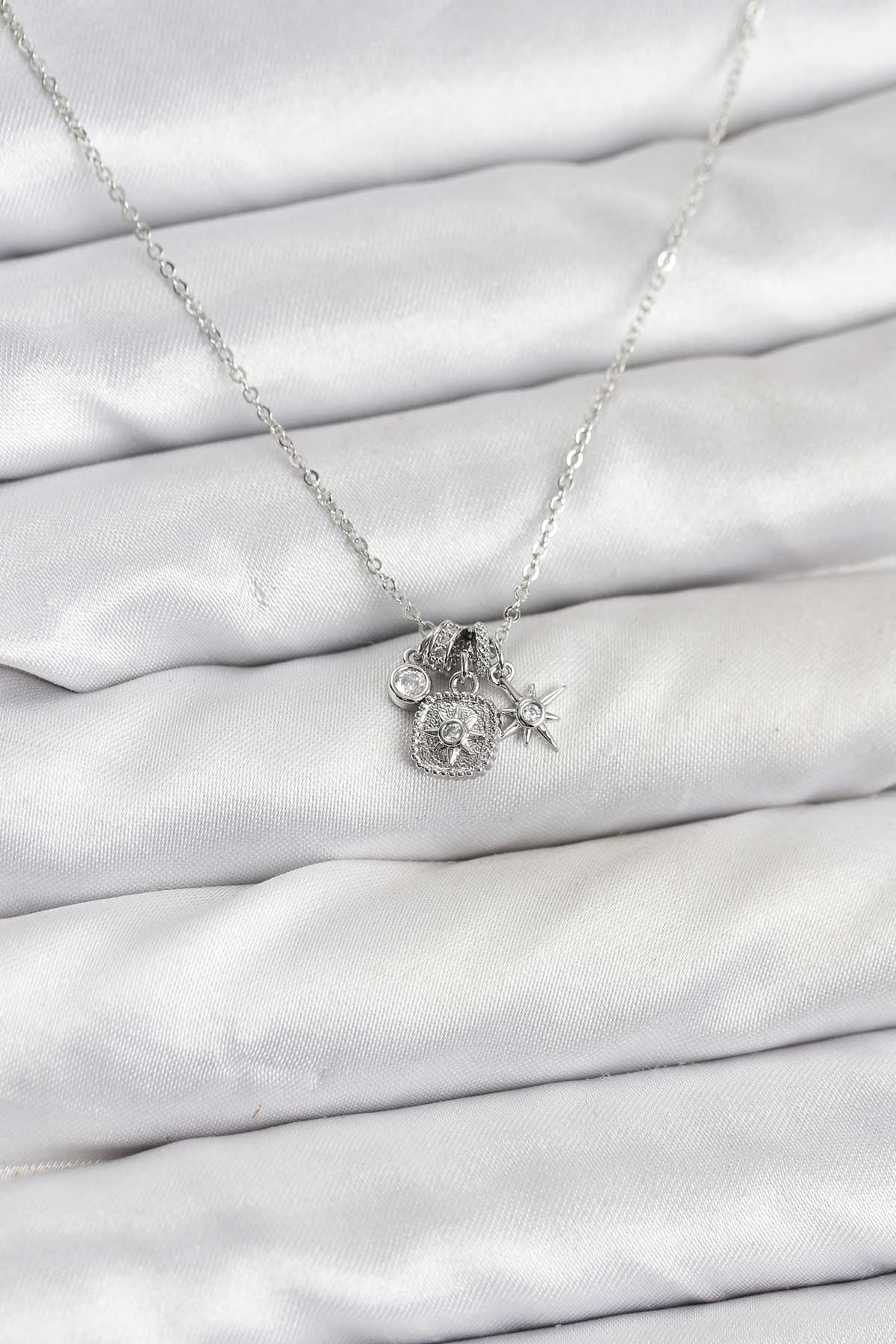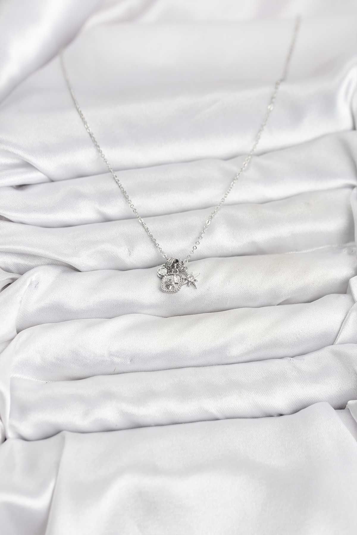 Pirinç Gümüş Renk Minimal Charmlı Kadın Kolye