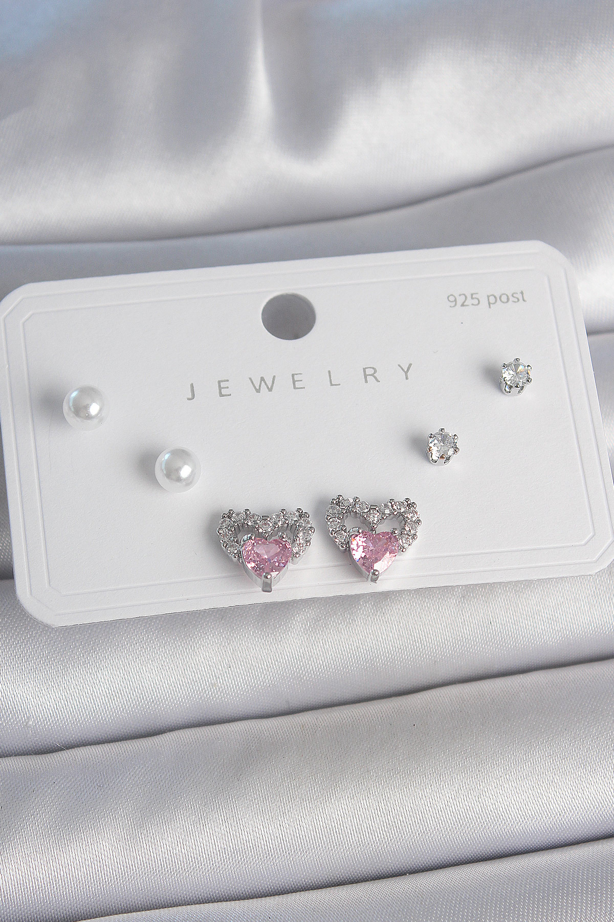 Pirinç Gümüş Renk Pembe Zirkon Taşlı Kalp Model İnci Detay 925 Ayar Gümüş Çivi Kadın Küpe Seti