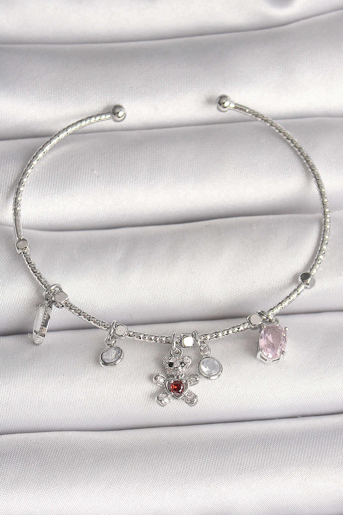 Pirinç Gümüş Renk Sallantı Zirkon Taşlı Ayıcık Figür Kırmızı Taş Detay Charm Kadın Bileklik
