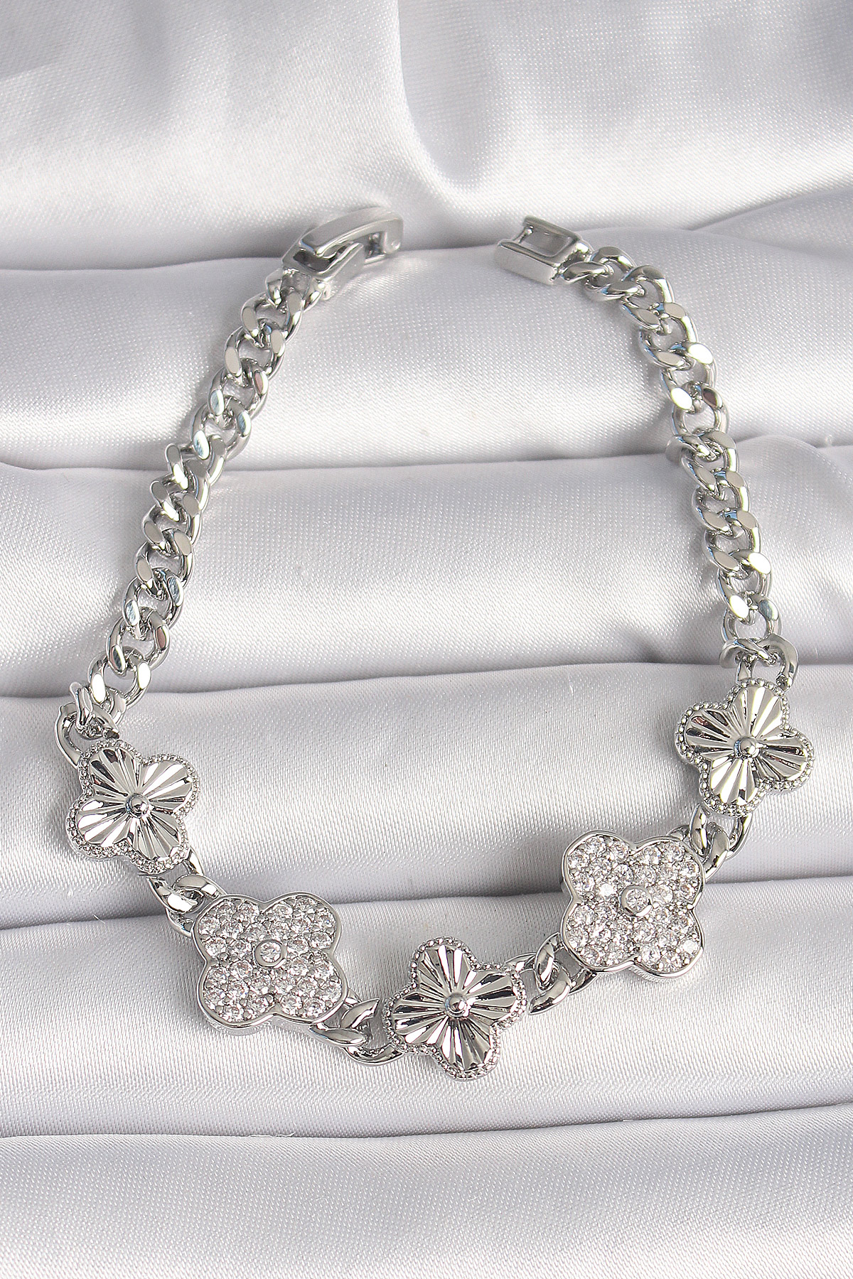 Pirinç Gümüş Renk Zincir Yonca Model Kadın Bileklik
