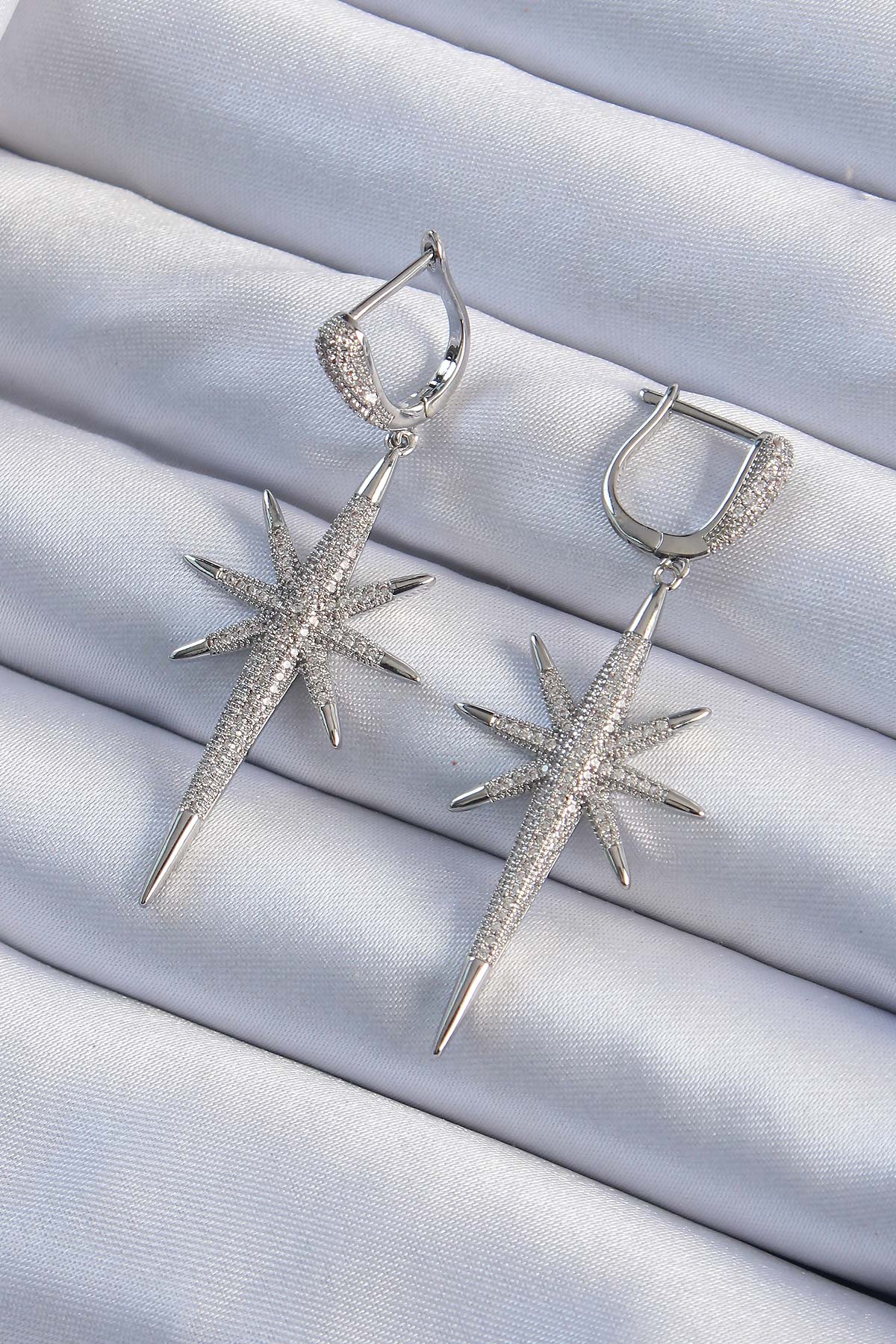 Pirinç Gümüş Renk Zirkon Taş Kaplama Kutup Yıldızı Tasarımlı Kadın Küpe