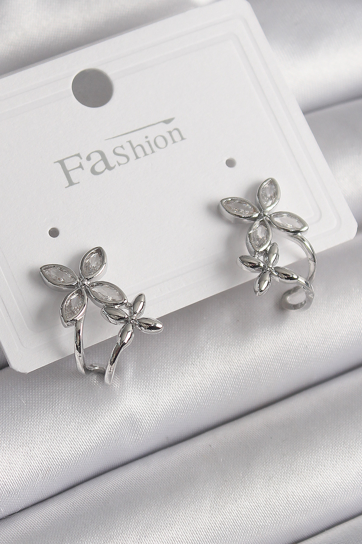 Pirinç Gümüş Renk Zirkon Taşlı 2'Li Çiçek Model Kadın Küpe