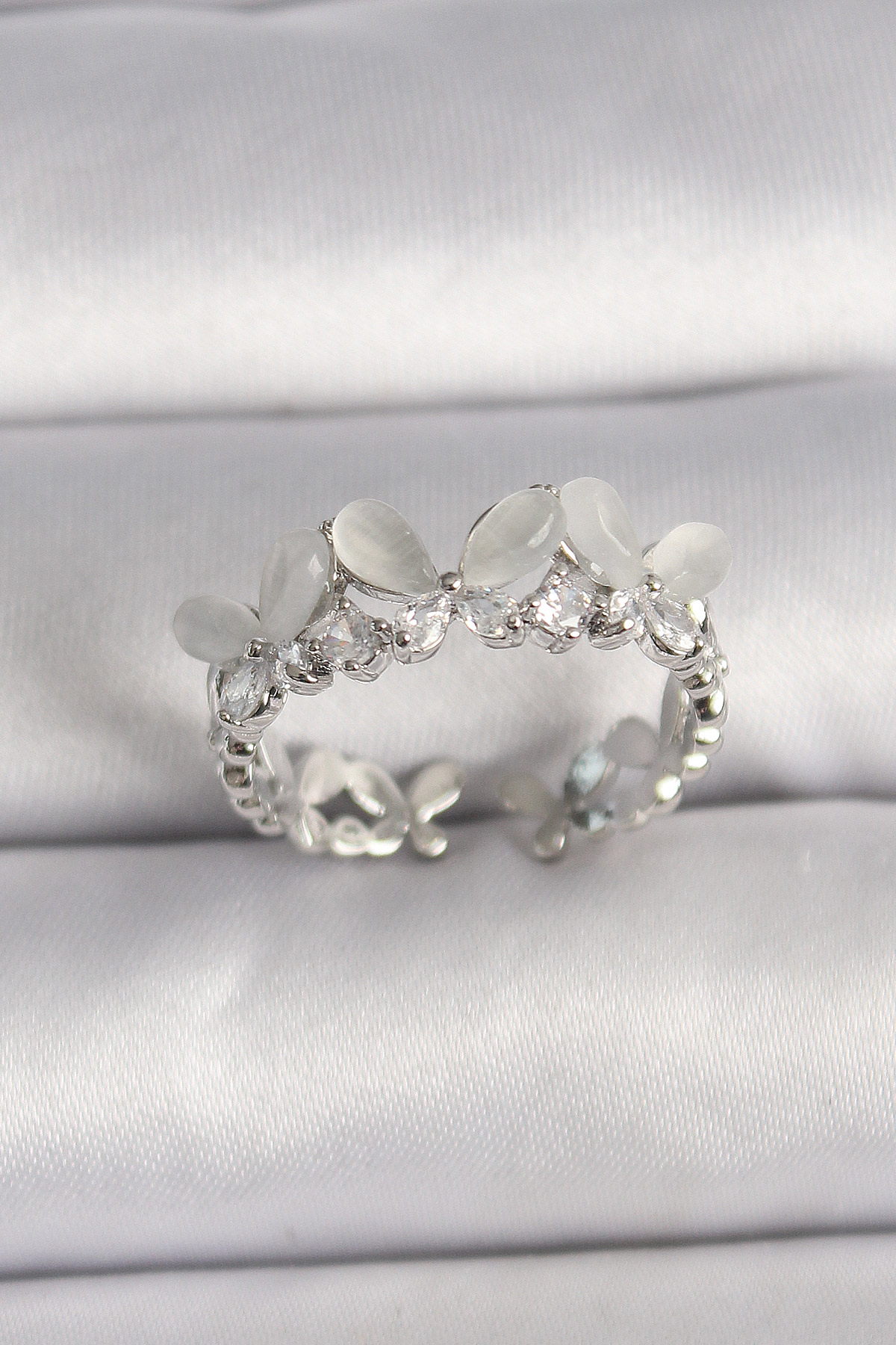 Pirinç Gümüş Renk Zirkon Taşlı Beyaz Mineli Kelebek Model Ayarlanabilir Yüzük