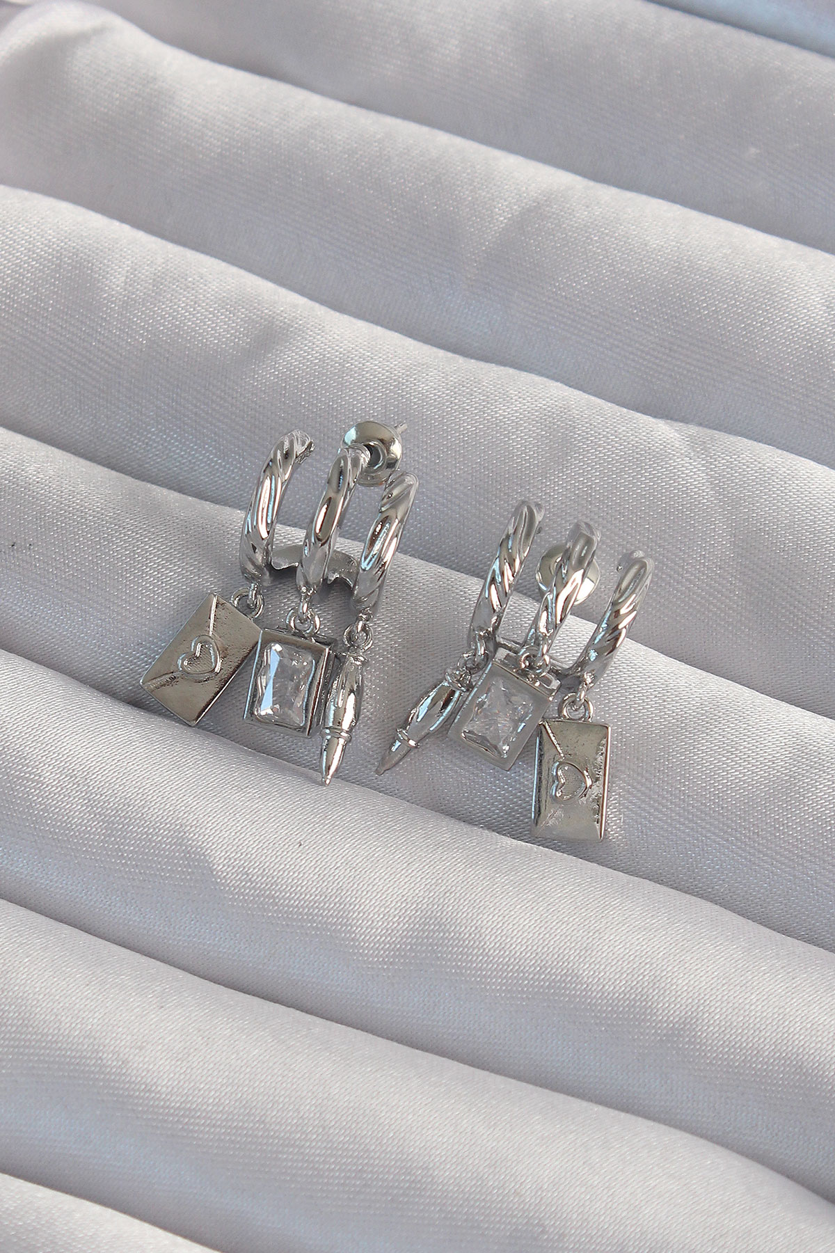 Pirinç Gümüş Renk Zirkon Taşlı Çoklu Aksesuarlı Yarım Halka Kaburga Küpe