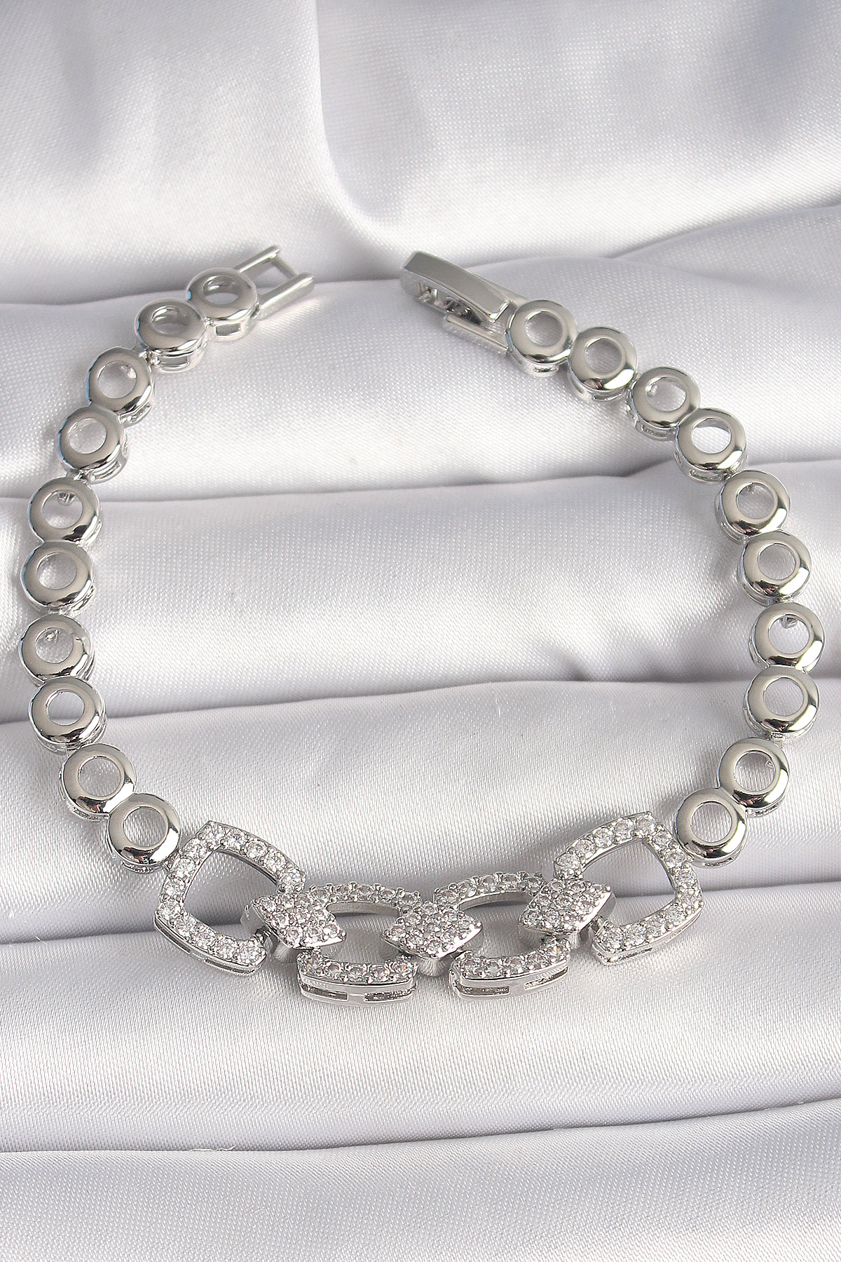 Pirinç Gümüş Renk Zirkon Taşlı Daire Zincir Model Kadın Bileklik