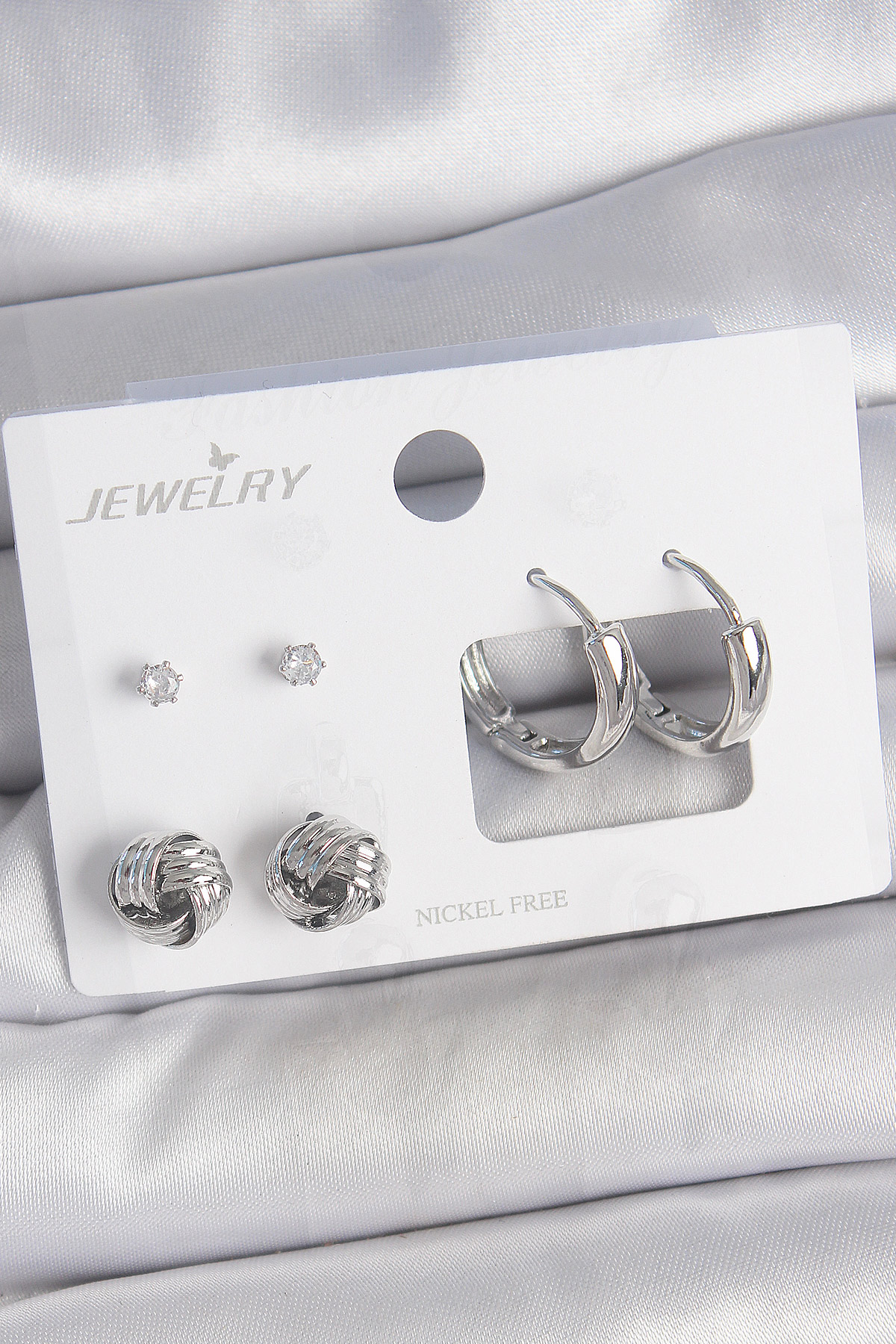 Pirinç Gümüş Renk Zirkon Taşlı Halka Model 3 Çift Kadın Küpe Seti
