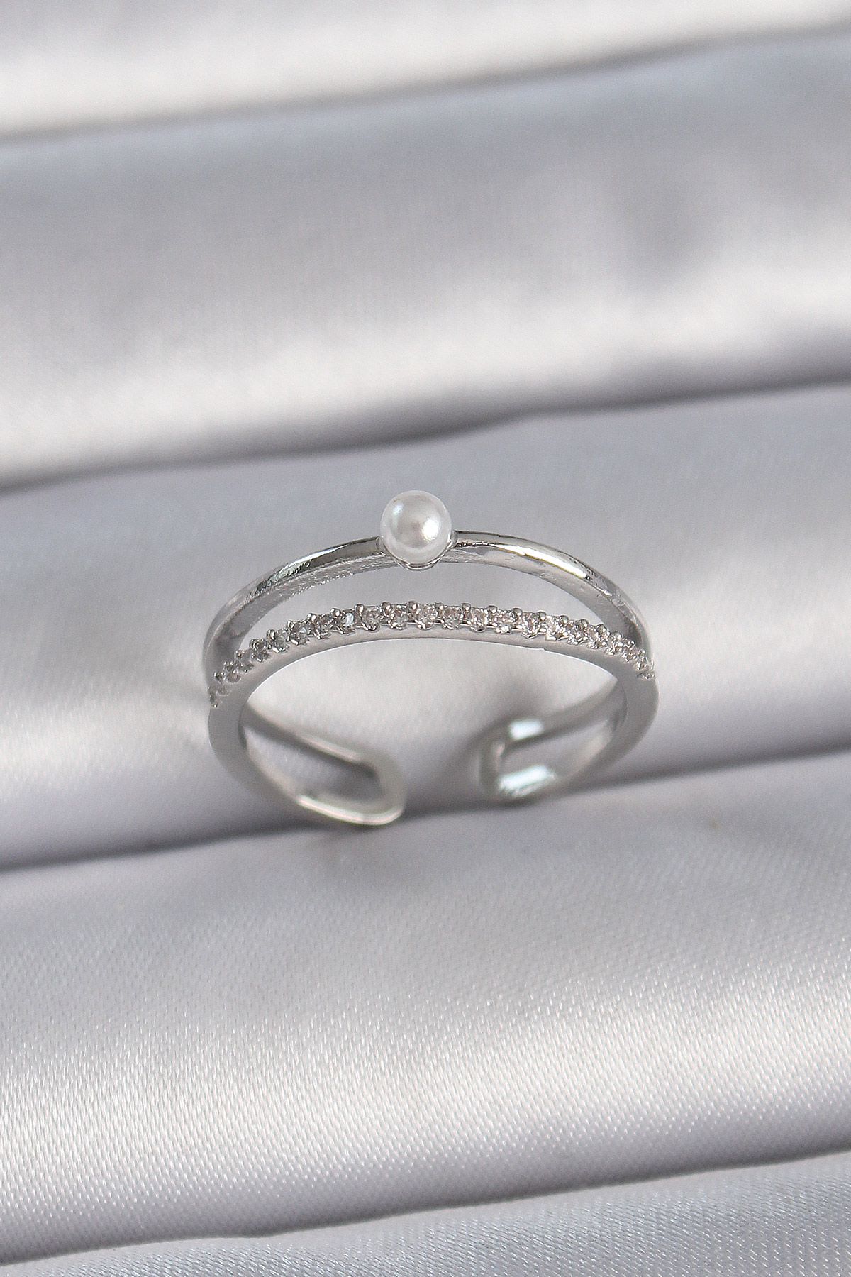 Pirinç Gümüş Renk Zirkon Taşlı İnci Detay Ayarlanabilir Model Kadın Yüzük