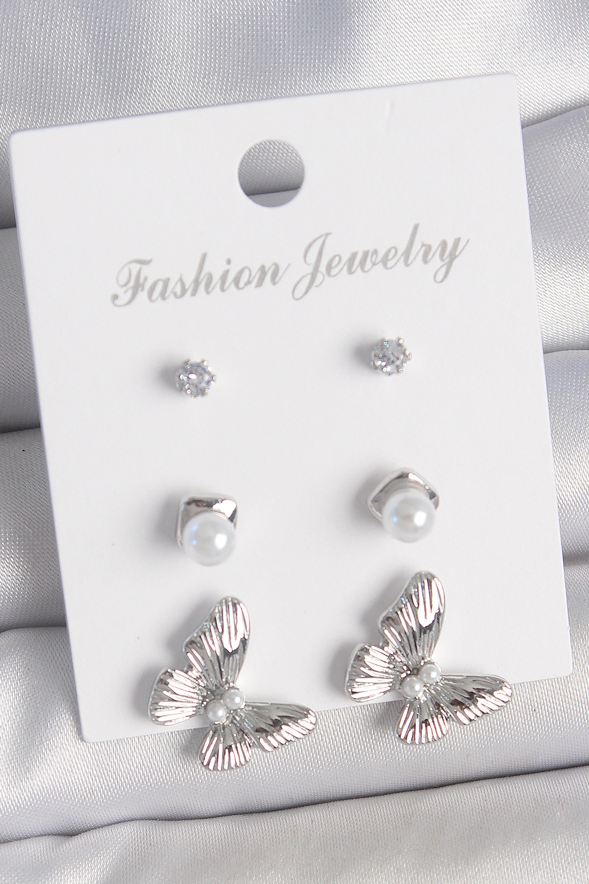 Pirinç Gümüş Renk Zirkon Taşlı İnci Detaylı Kelebek Model 3 Çift Kadın Küpe Seti
