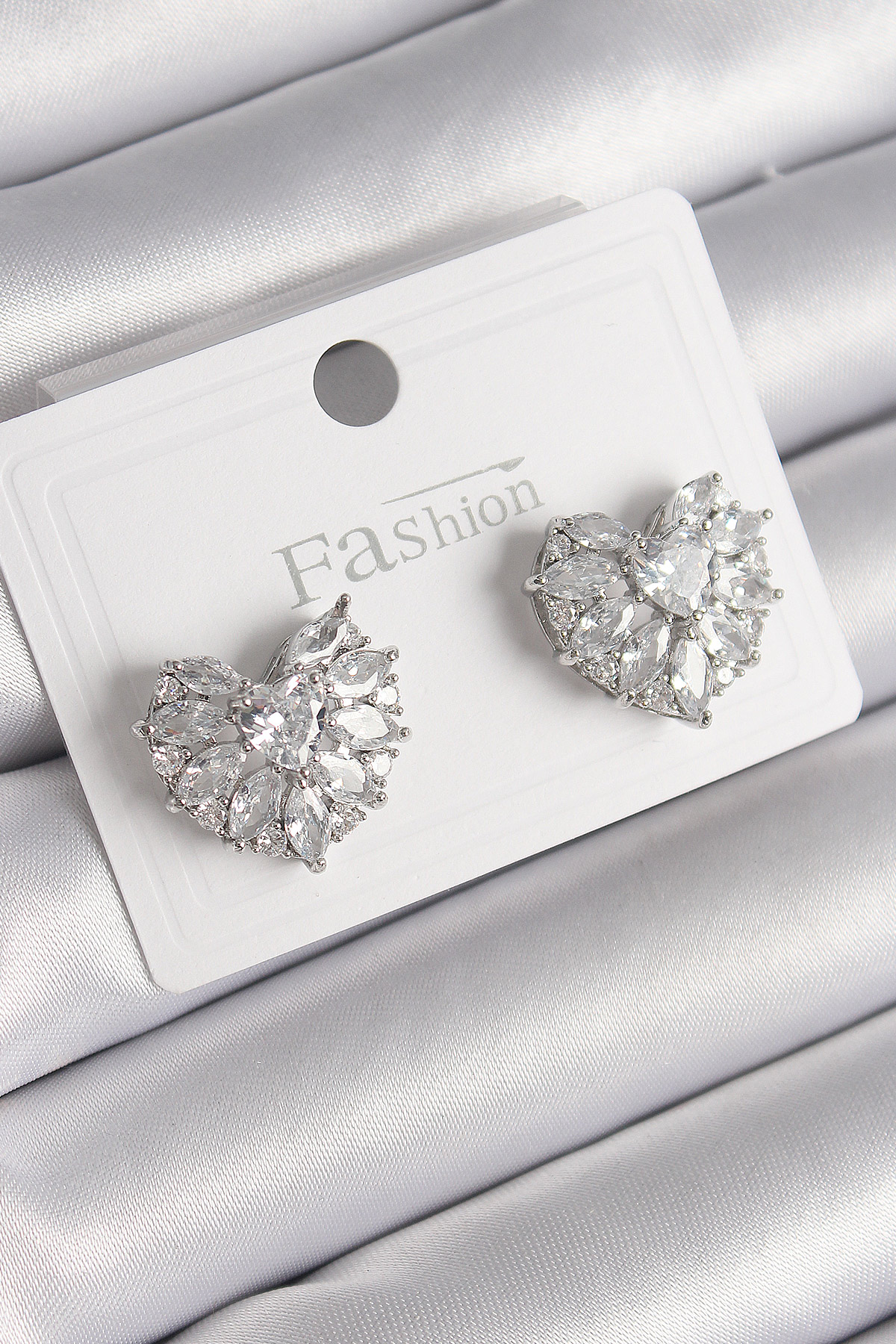 Pirinç Gümüş Renk Zirkon Taşlı Kalp Model Kadın Küpe