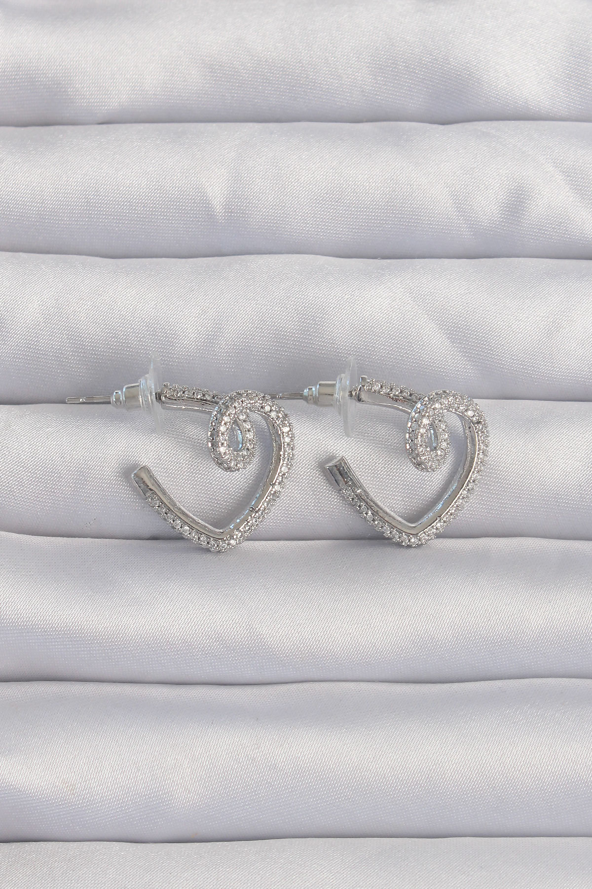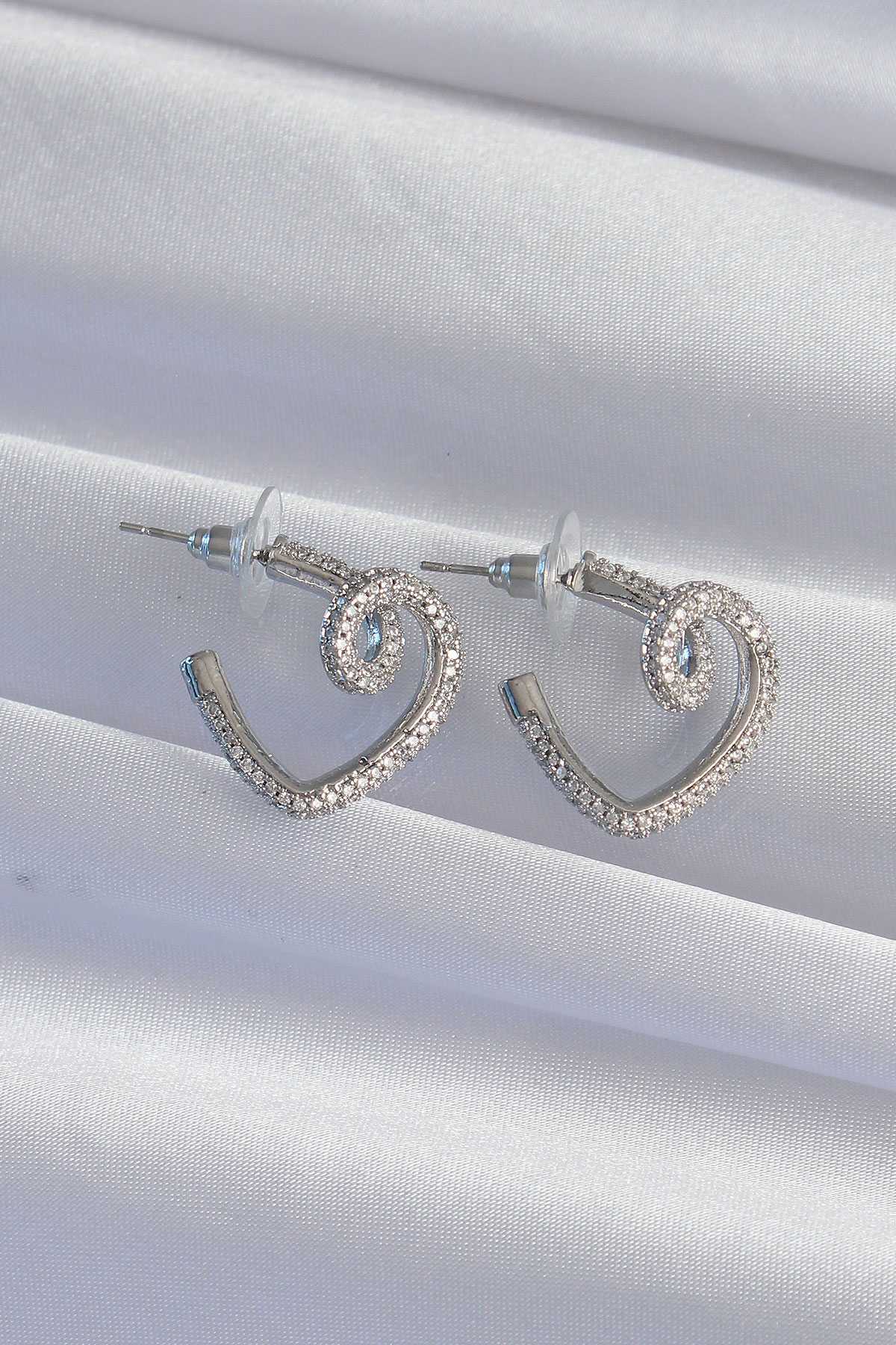 Pirinç Gümüş Renk Zirkon Taşlı Kıvrımlı Yarım Kalp Küpe