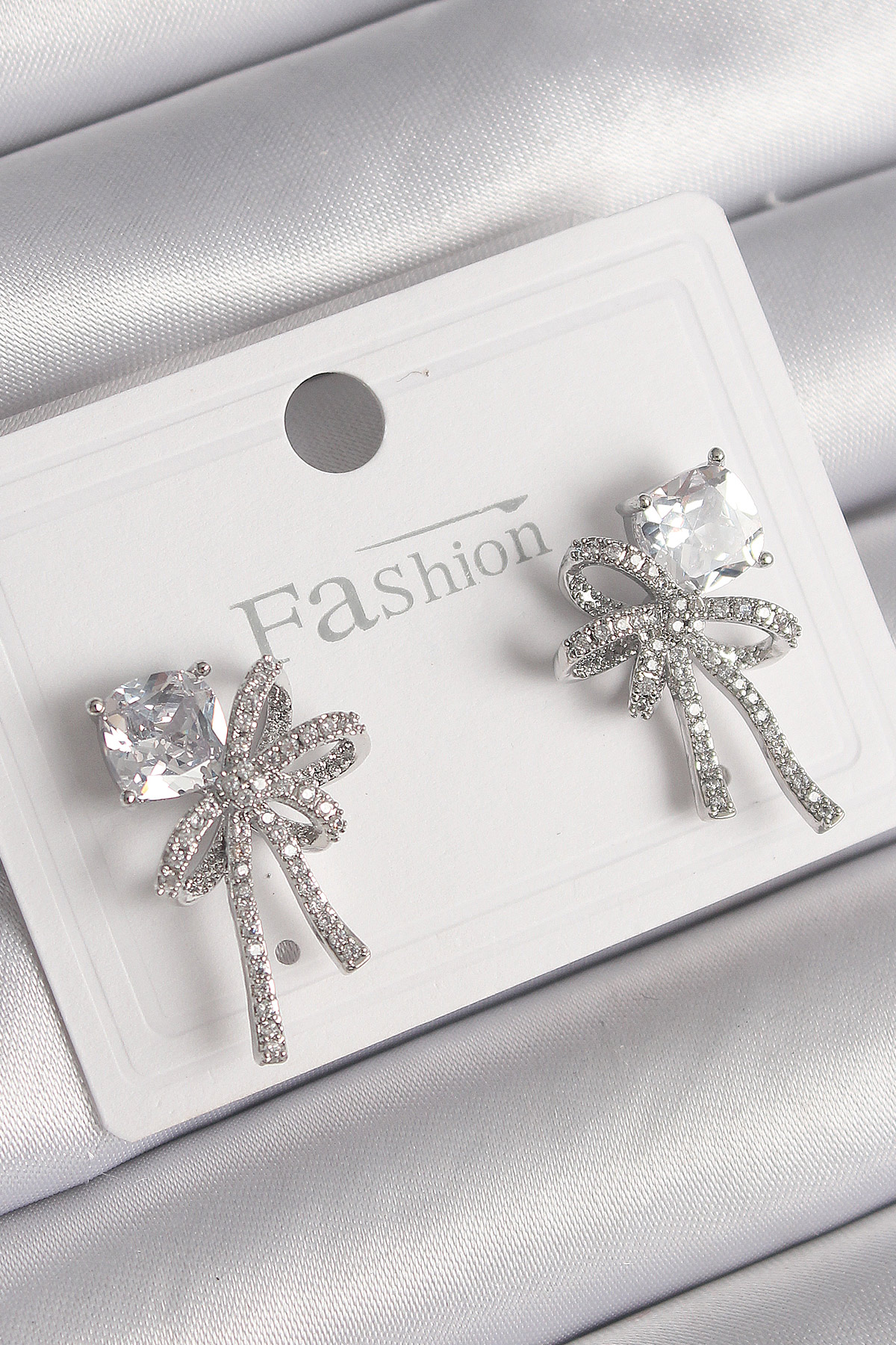 Pirinç Gümüş Renk Zirkon Taşlı Kurdele Model Kadın Küpe