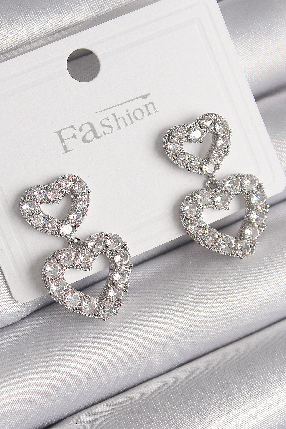 Pirinç Gümüş Renk Zirkon Taşlı Sallantı Kalp Model Kadın Küpe
