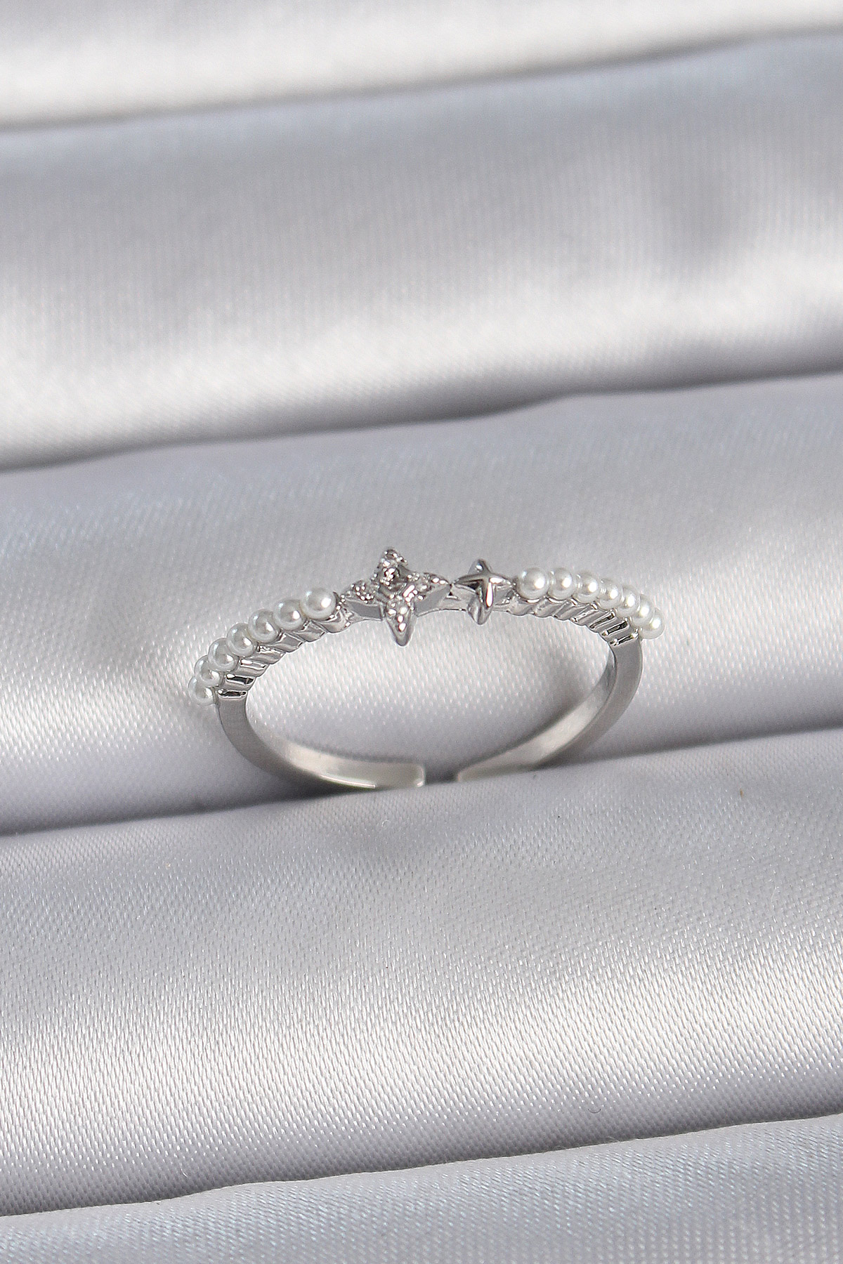 Pirinç Gümüş Renk Zirkon Taşlı Sıralı İnci Ayarlanabilir Model Kadın Yüzük