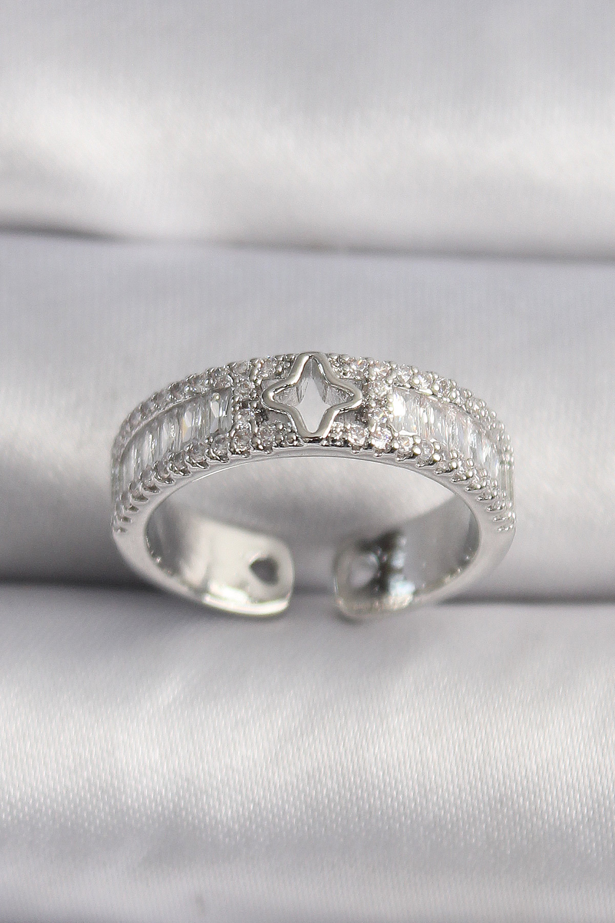 Pirinç Gümüş Renk Zirkon Taşlı Yıldız İşleme VIP Seri Kadın Yüzük